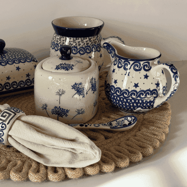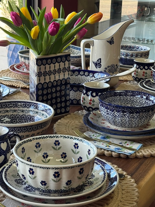 A timeless tablescape made entirely of traditional Polish Pottery in classic blue and white patterns—elegant, harmonious, and unmistakably heirloom-worthy