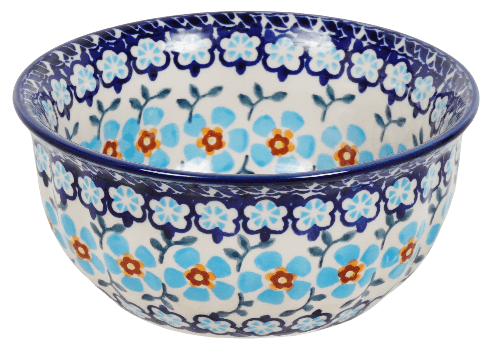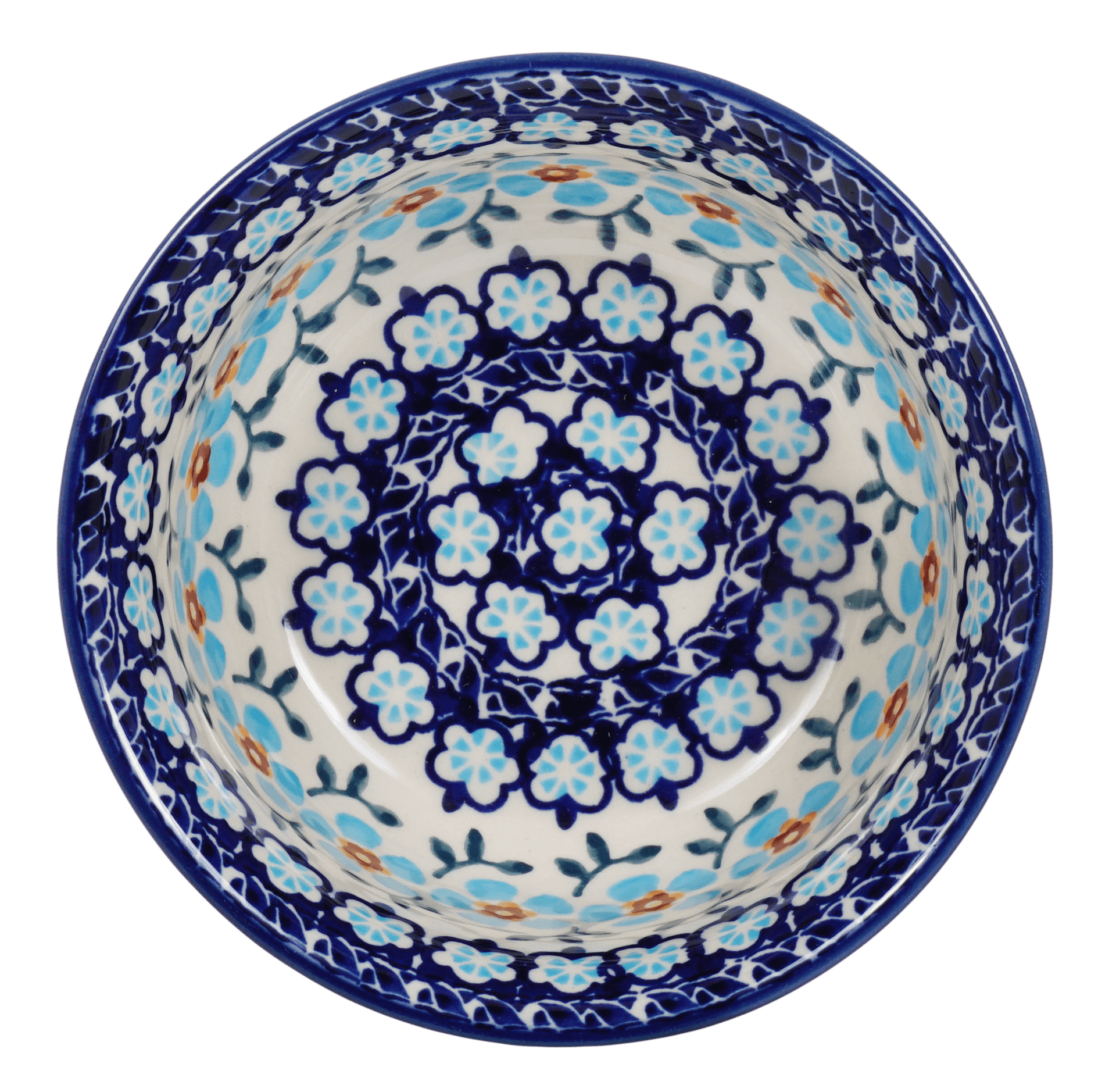 The "Sky Blue Border" pattern of this bowl is a testament to the exquisite artistry of Polish pottery. Set against a crisp white background, simple sky blue blossoms dance in harmony with ribbons of blue and white, creating a visual symphony that is sure to captivate. Surrounding the center is a dense band of light blue flowers, punctuated by teal blue twigs, adding a touch of rustic elegance to your dining experience. This design not only showcases the Unikat level of craftsmanship—reserved for designs that require advanced skill and incorporate an extensive palette—but also bears the exclusive "UNIKAT" stamp, a guarantee of its uniqueness and quality.