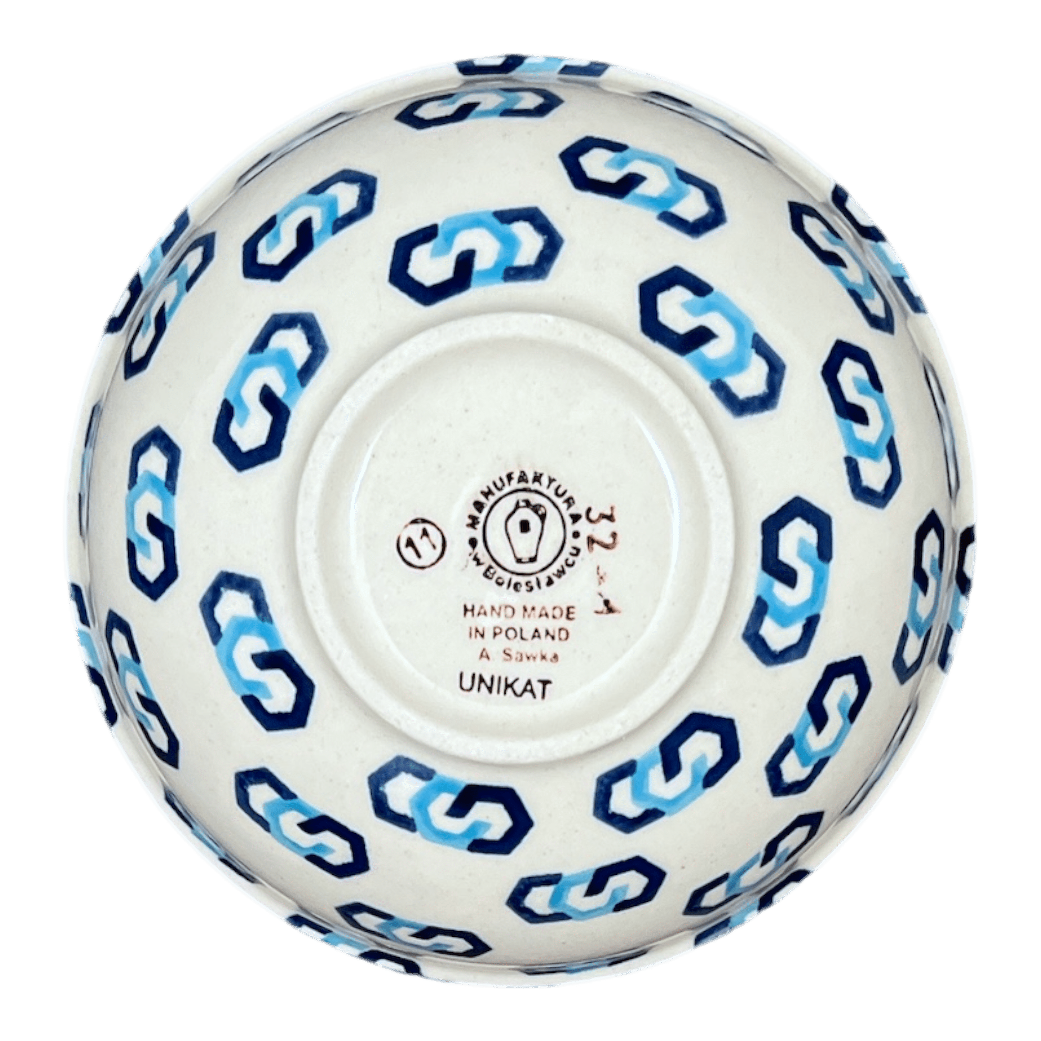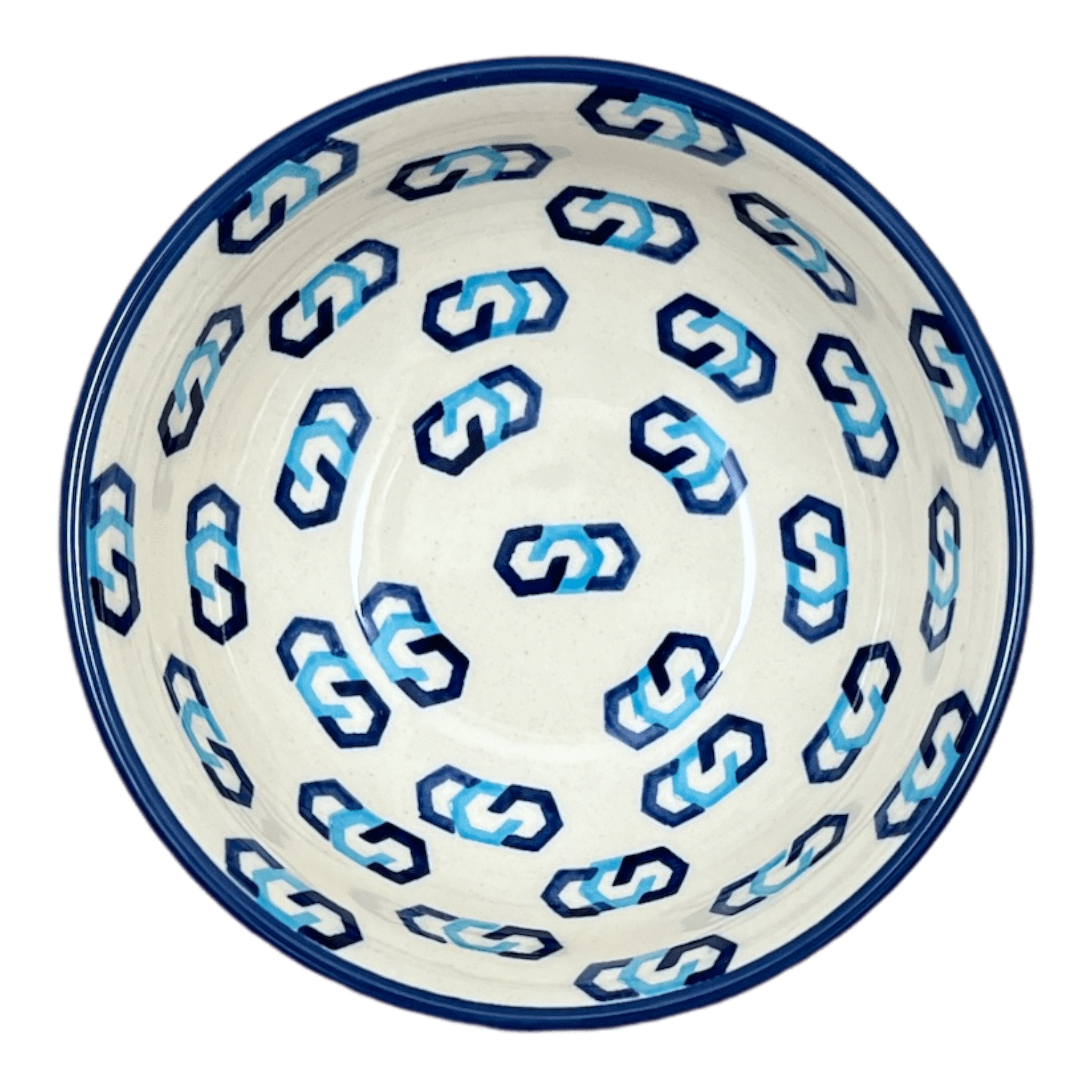 Introducing the enchanting 6" Polish Pottery Bowl from Manufaktura, a true gem in the "Chain Reaction" pattern, adorned in a mesmerizing dance of cobalt and light blue hues. This captivating piece isn't just a bowl; it's a versatile treasure trove for your culinary delights! Imagine starting your day with a hearty cereal breakfast, plunging your spoon into this bowl, or winding down with a comforting evening soup. Each bite not only satisfies your cravings but also lets you feast your eyes on a unique work of art. The "Chain Reaction" pattern, featuring geometric chains in three shades of blue, brings a splash of color and sophistication to any meal.