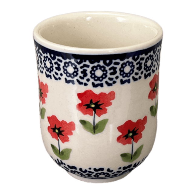 Imagine sipping your favorite wine or fresh juice from a cup that's not just a drinkware but a piece of art! Introducing the Polish Pottery Drinkware, Wine Cup, 6 oz from Manufaktura in the enchanting "Poppy Garden" pattern. This charming cup, with its delightful floral design, isn't just for beverages; it's also perfect for adding a whimsical touch to your bathroom or vanity table as a holder for cotton swabs or makeup brushes. Crafted in Boleslawiec, Poland, this cup showcases the vibrant red poppies and gentle white flowers, blooming against a serene blue background, accented with hints of green. This traditional pattern breathes life and color into any setting, making every sip a little more special.