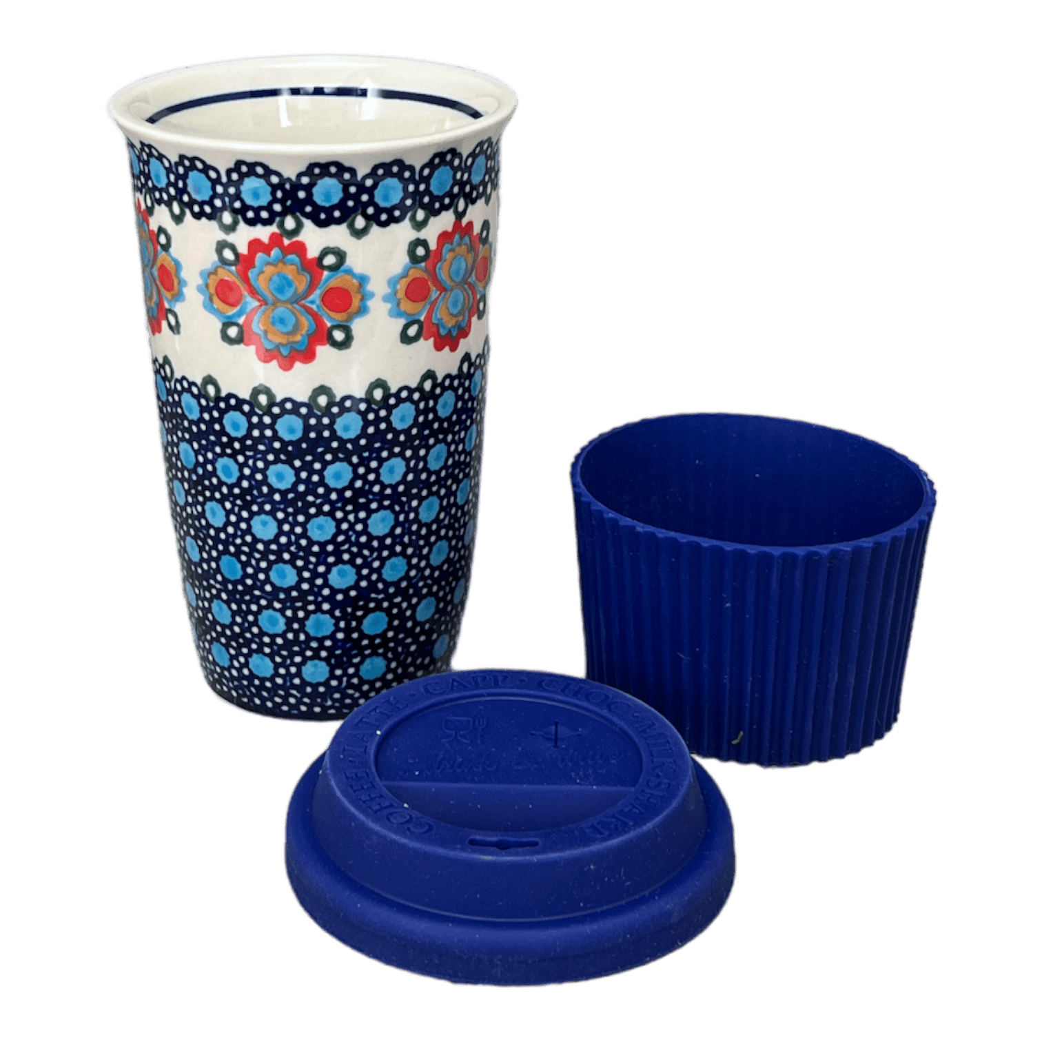 Embark on an adventure with the vibrant and versatile Polish Pottery Mug, Travel, 14 oz, Andy (NDA281), intricately designed in the enchanting "Polish Bouquet" pattern. Crafted with love by the esteemed artisan Andy in Boleslawiec, Poland, this travel mug not only captivates with its floral dance of blue hues and red accents but also boasts practicality with its accompanying silicone lid and sleeve. Imagine sipping your morning brew from this masterpiece, or simply remove the accessories to transform it into an elegant tumbler, perfect for any beverage of choice. This mug is more than just a container; it's a portal to Polish tradition, right in the palm of your hand.