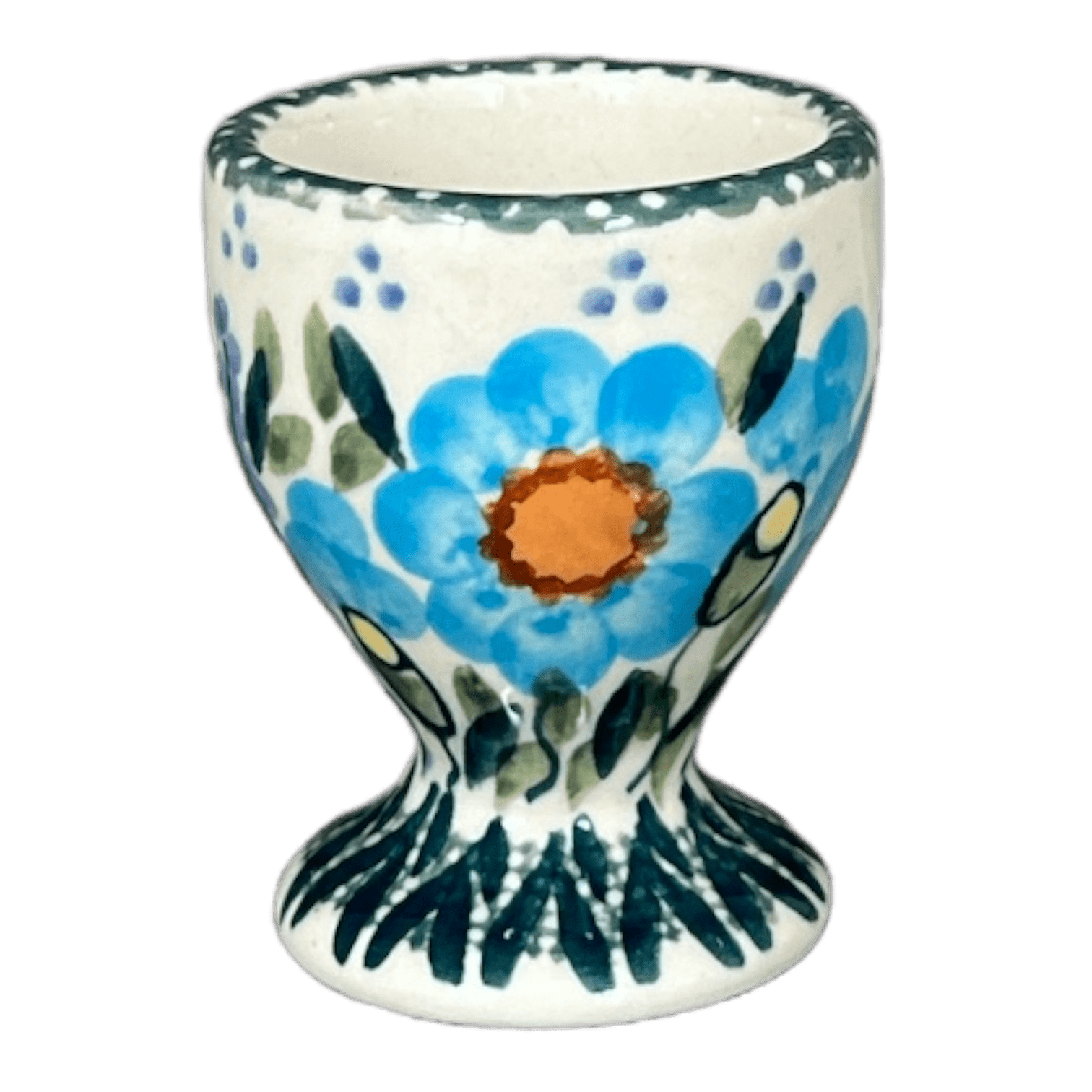 Imagine a morning where your breakfast not only tastes good but also looks enchantingly beautiful. That’s what the Polish Pottery Egg Cup from Manufaktura offers with its delightful "Baby Blue Blossoms" pattern. Picture this: a gentle array of sky blue and orange flowers, surrounded by teal green leaves and tall, whispering grass, all set against a crisp white background. This 2.5-inch egg cup, handcrafted in Boleslawiec, Poland, is a small masterpiece, turning your simple soft-boiled egg into a centerpiece of your morning table.