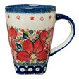 Start your day off right with a cup of coffee or tea in a Polish pottery mug from Galia! The "Poinsettias" pattern is a vibrant and eye-catching design that will bring a pop of color to your morning routine. With its large red poinsettias, green pine needles, and accents in blue and green, this mug is truly a work of art.