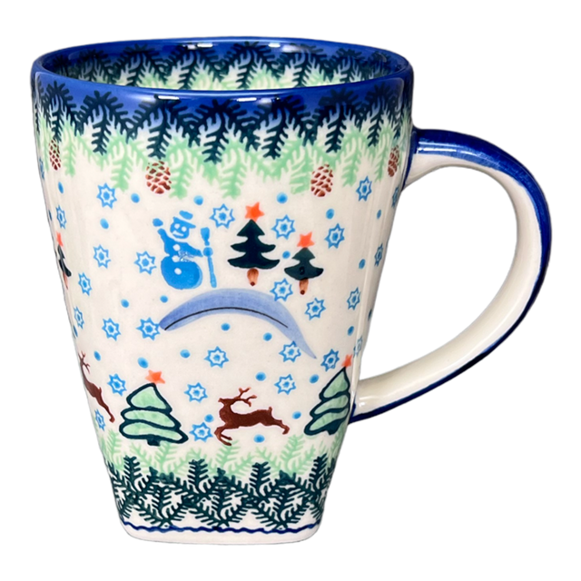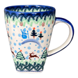 Imagine sipping your morning coffee or tea from a mug that not only wakes you up but also whisks you away to a snowy Christmas scene. That's exactly what the Polish Pottery Mug, Tapered Mug, 20 oz, in the enchanting "Reindeer Dance" pattern by Galia offers. This stunning mug features playful reindeer, charming snowmen, and serene pine trees, all beautifully set against a crisp white background adorned with delicate blue snowflakes and a vibrant green pine needle border. Every sip feels like a celebration of winter's joys!