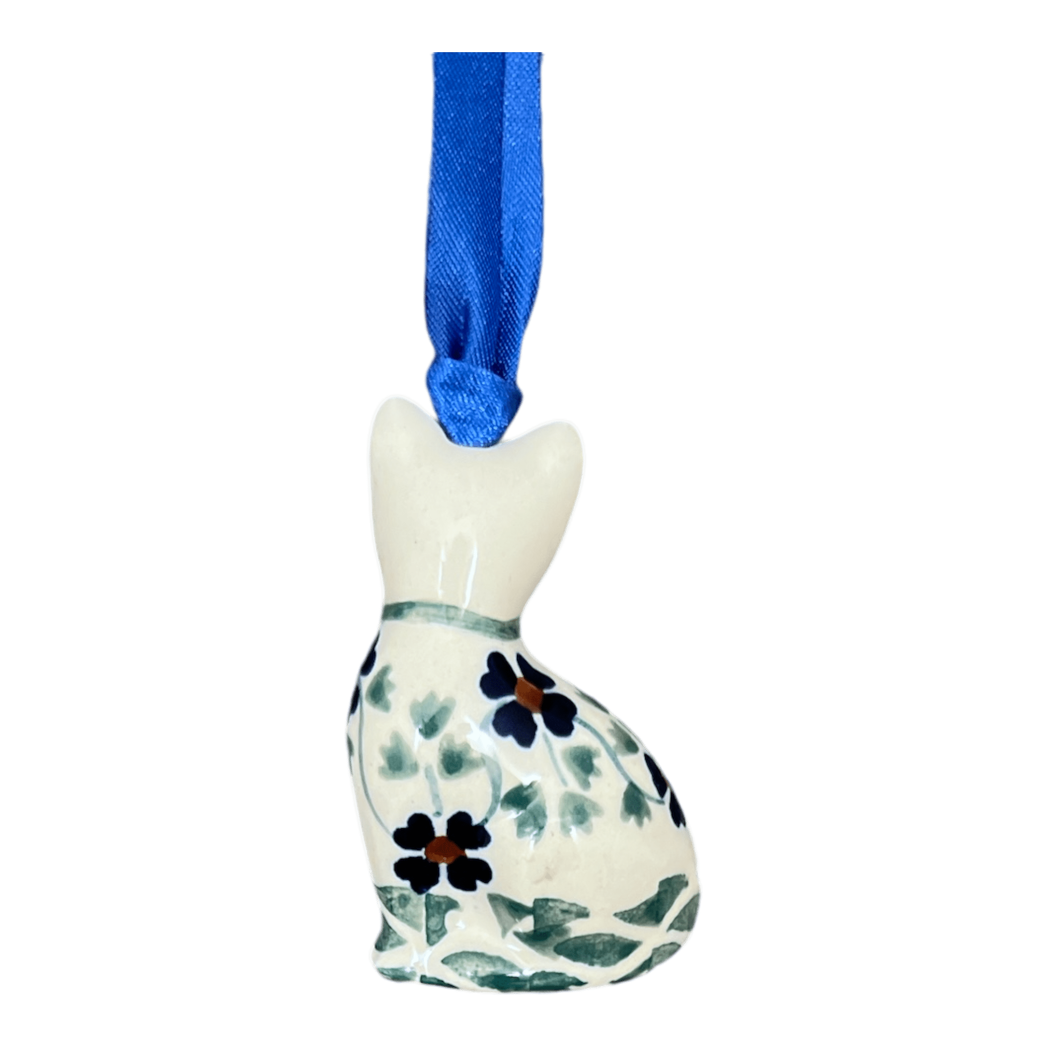 Introducing the charming Polish Pottery Ornament in the delightful "Woven Pansies" pattern, expertly crafted by Manufaktura. This petite feline-shaped gem, measuring a cute 1.5" x 1" x 2.5", is hand-painted in Boleslawiec, Poland, known for its rich pottery heritage. The "Woven Pansies" design enchants with its intricate display of green weaving at its heart, surrounded by a whimsical band of small, simple flowers in shades of blue and orange, all connected by a slender green vine. This design not only captivates the eye but also tells the story of traditional Polish craftsmanship, where each piece is a canvas of nature-inspired beauty.