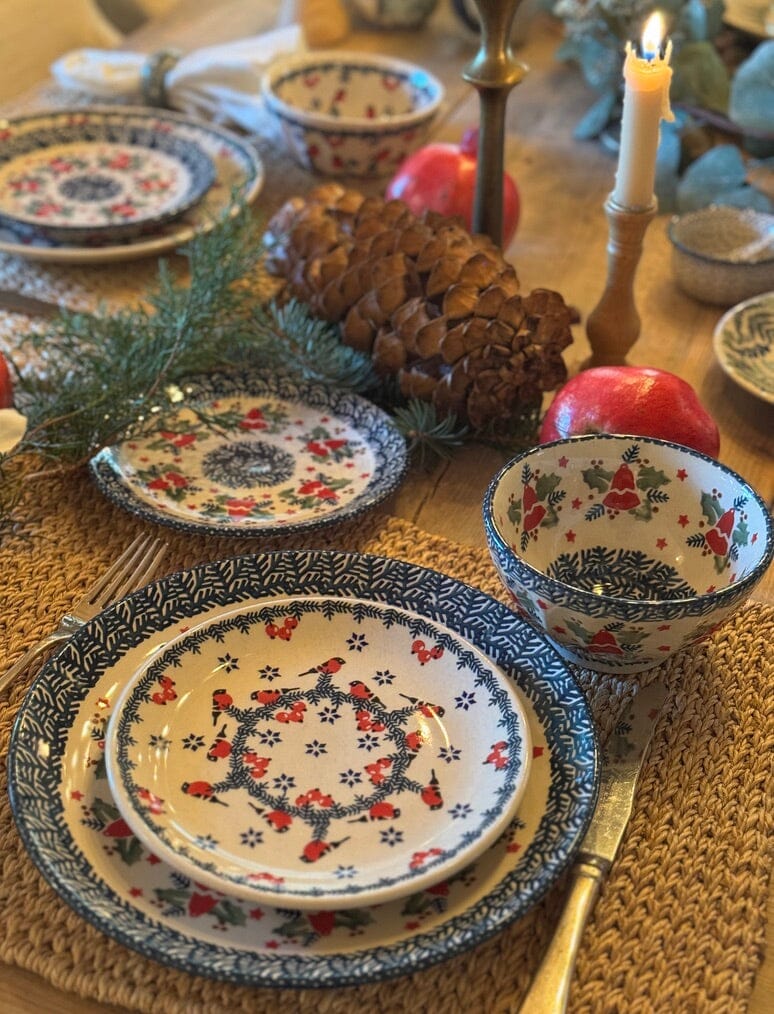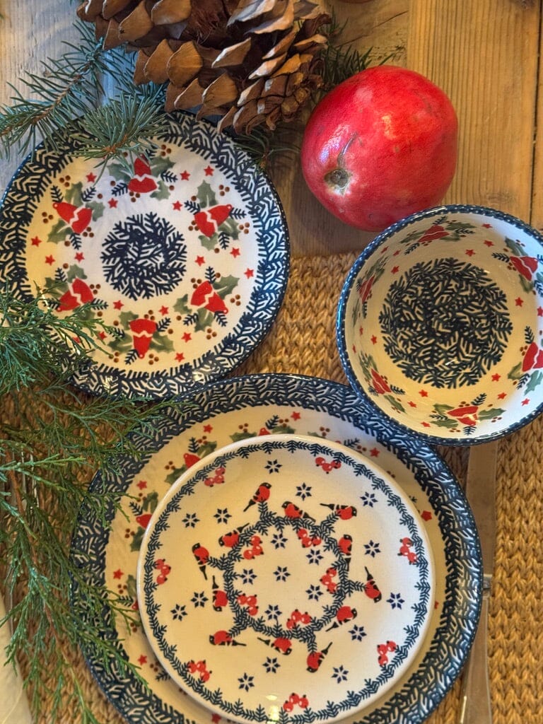 Imagine a table adorned with the charming vibrance of the Polish Pottery Plate, a delightful 6.5" dessert round by Manufaktura, showcasing the enchanting "Red Bird" pattern. This petite plate, perfect for serving scrumptious desserts, appetizers, or even daily bread, brings not just utility but a sprinkle of festive spirit to your dining decor. The "Red Bird" pattern dances with joyful simplicity, featuring a pristine white background encircled by a thin evergreen wreath, punctuated by vibrant red berries. Playful red birds and whimsical small blue snowflakes scatter across, creating a tableau that whispers tales of wintery Christmas mornings.