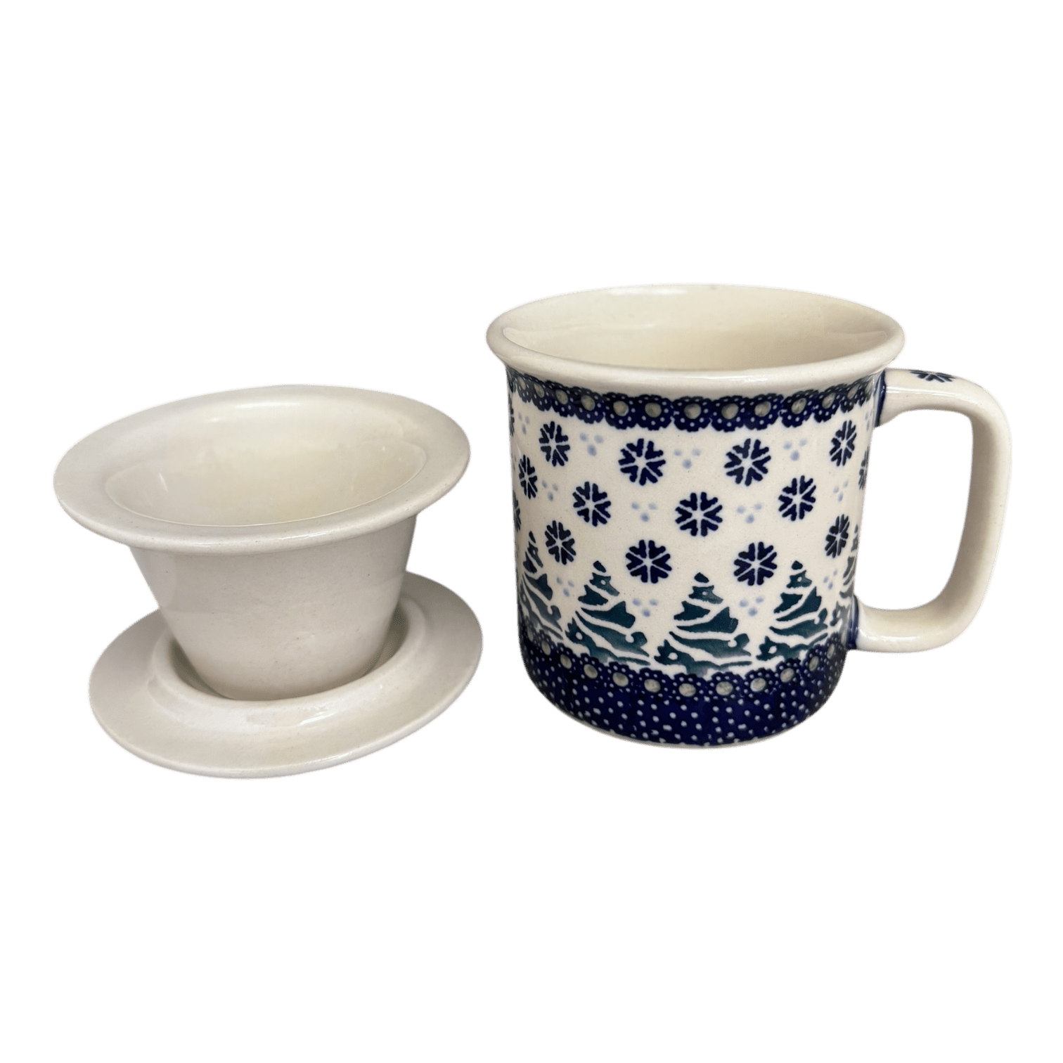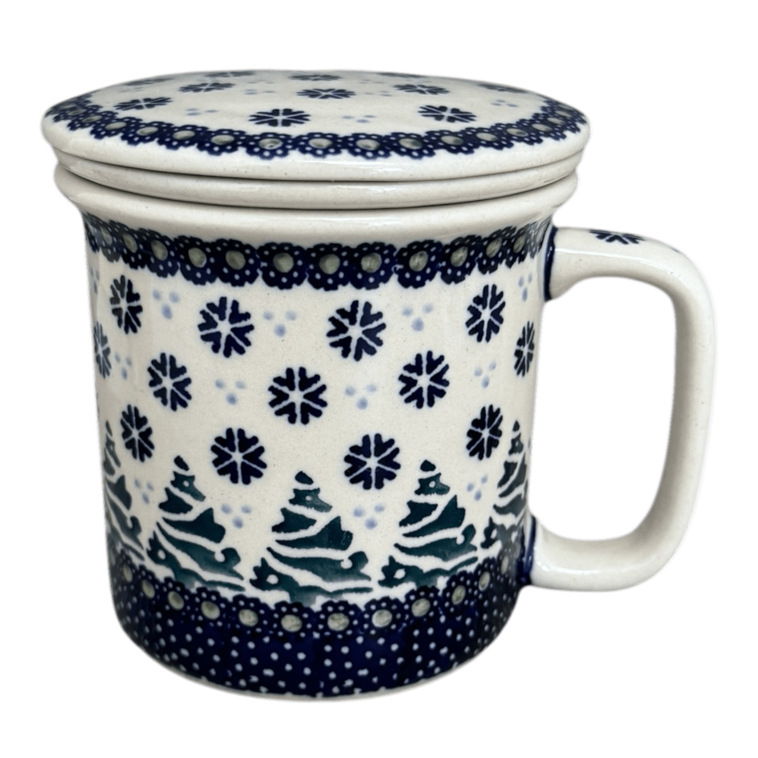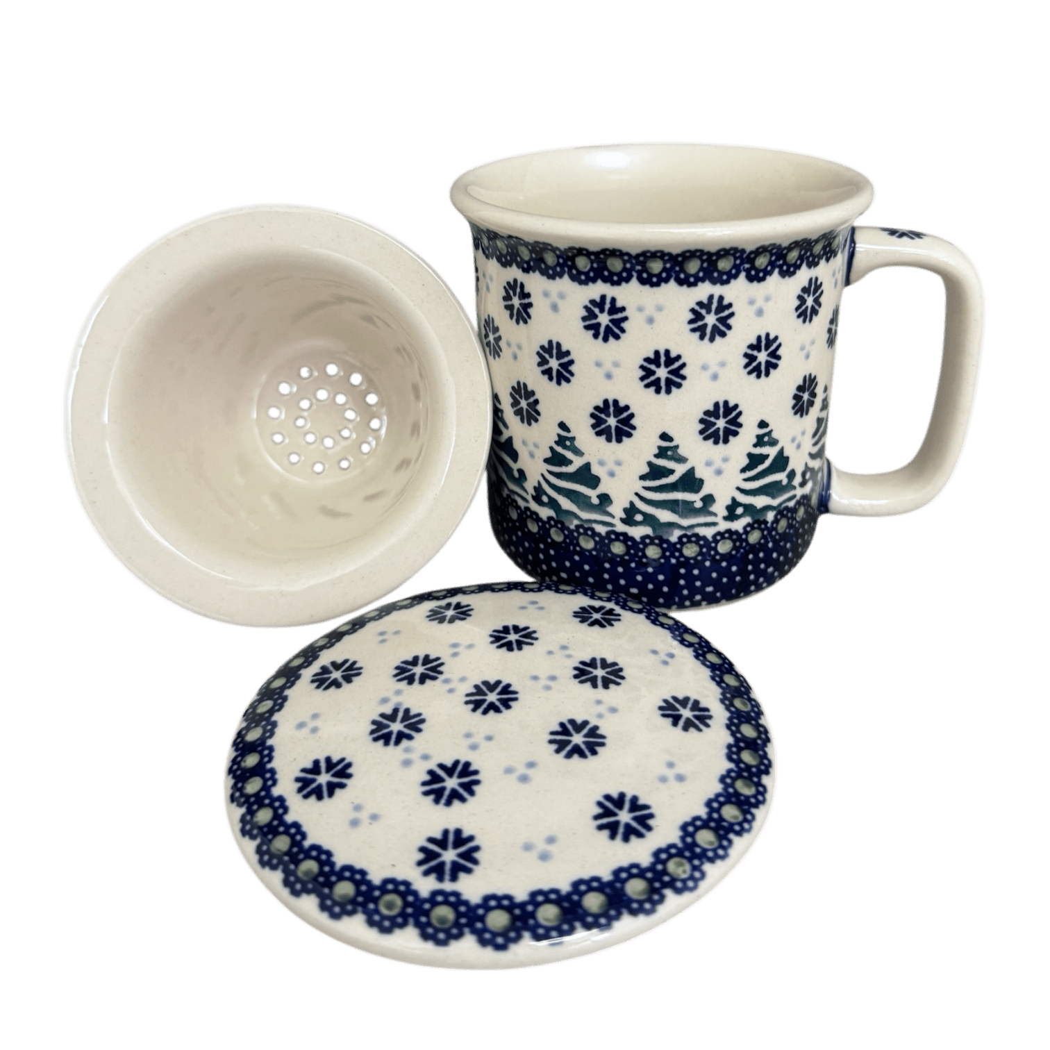 Imagine sipping your favorite tea from a mug that not only keeps your brew perfectly warm but also adds a dash of artistic flair to your day! Introducing the Polish Pottery Mug, Tea Infuser Mug, 12 oz, from Manufaktura in the enchanting "Snowy Pines" pattern. This delightful three-piece set is designed for the ultimate tea experience, whether you prefer the robust flavors of loose-leaf or the convenience of bagged tea. Simply add your chosen tea to the infuser, pour in boiling water, and use the cleverly designed lid to cover your mug, ensuring your tea stays hot as it steeps. If you're using a tea bag, the lid doubles as a chic little tray for it once your tea has steeped to perfection.