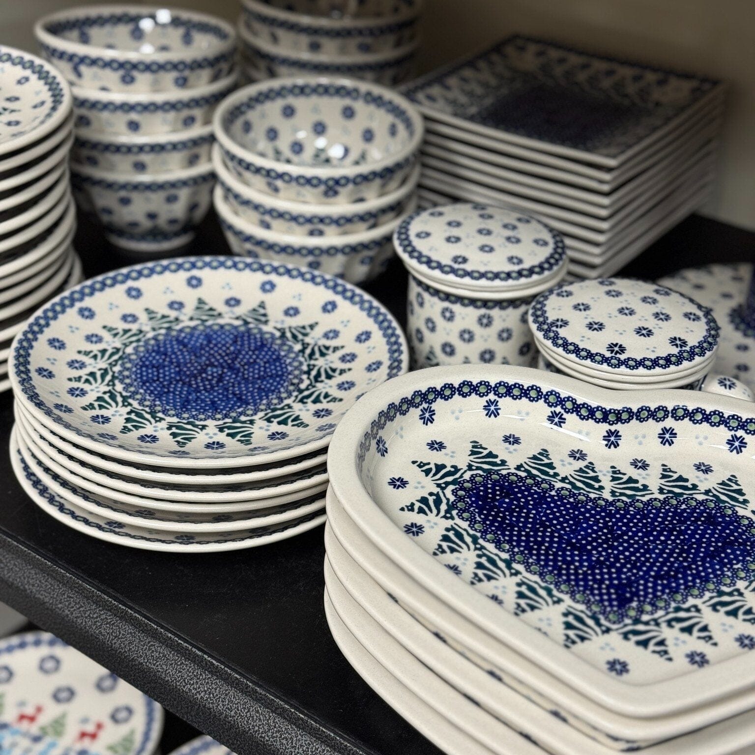 The "Snowy Pines" pattern is a magical representation of a winter wonderland, featuring a serene blue background dotted with tiny white specks, evoking the tranquil essence of falling snow. A ring of teal Christmas trees encircles the mug's center, adding a festive touch, while bands of simple blue snowflakes dance against a crisp white sky above. This traditional pattern, created using the unique "punching" technique of hand stamping by skilled artisans, is a testament to the timeless beauty and craftsmanship of Polish pottery. Each piece, hand-painted in Boleslawiec, Poland, is a work of art, varying slightly from one to the next, giving your collection its unique charm.