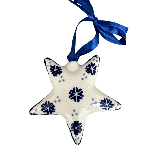 Imagine a winter wonderland twinkling with the soft glow of festive lights and the air filled with the crisp scent of pine trees. Now, picture your Christmas tree adorned with the charming Polish Pottery Star Ornament from Manufaktura, bringing a touch of this magical winter scene right into your living room! This delightful 3-inch star, crafted in the heart of Boleslawiec, Poland, features the enchanting "Snowy Pines" pattern. With its serene blue backdrop dotted with tiny white specks, a lively band of teal Christmas trees dances around the center, while playful blue snowflakes gently fall against a white sky. It's a traditional Polish pottery pattern that brings the joyous spirit of Christmas to any space.