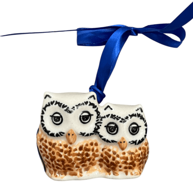 Introducing the enchanting Two Owl Polish Pottery Ornament from Manufaktura, a dazzling gem that captures the mystical hues of a "Desert Sunrise." Handcrafted in the heart of Boleslawiec, Poland, this delightful ornament stands at a petite 2 inches tall but bursts with an explosion of color and intricate design. Adorn your festive spaces with this unique piece, featuring the Unikat pattern known for its intricate artistry and vibrant, geometric designs. Drenched in an orange backdrop with playful dots, surrounded by a radiant halo of yellow and blue suns, each ornament tells a story of skillful craftsmanship and creative passion.