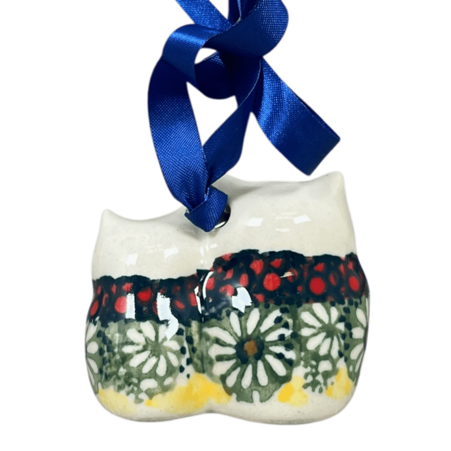Imagine hanging a little piece of art on your Christmas tree this year! Introducing the delightful Polish Pottery Ornament, featuring the charming "Two Owl" design, meticulously handcrafted by the artisans of Manufaktura in the vibrant "Sunshine Grotto" pattern. This enchanting ornament, measuring 2 inches in both height and width, is painted in a joyful palette of predominantly yellow, with playful splashes of green and red. The design draws you in with its bright yellow backdrop and a whimsical band of light green, adorned with white flowers along the edges. Tiny teal dots and small orange flowers add an intricate layer of detail, creating a festive atmosphere that’s hard to resist!