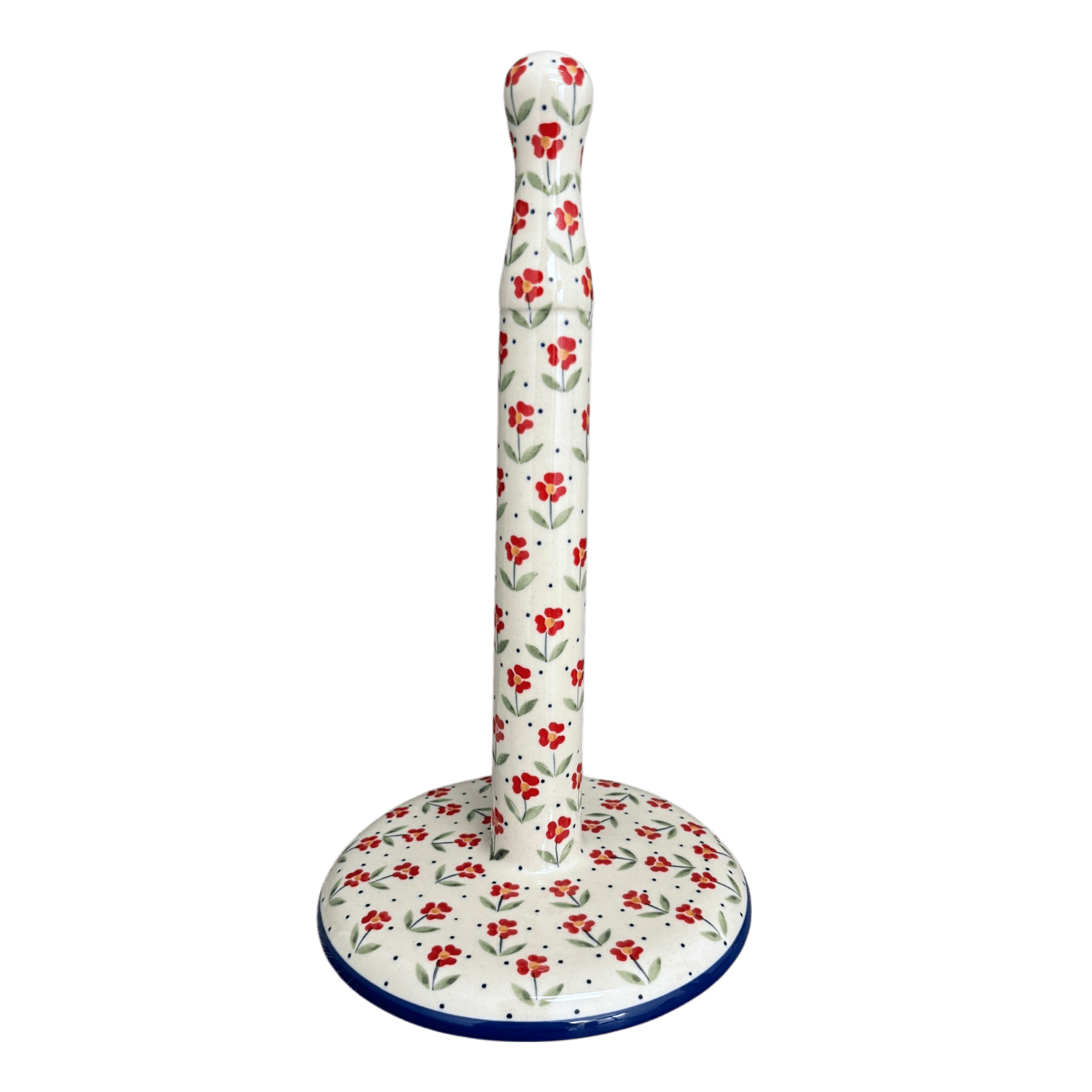Step into the enchanting world of Polish pottery with the "Simply Beautiful" Polish Pottery Paper Towel Holder from Manufaktura, a piece that marries practicality with exquisite artistry. Standing proudly at 14 inches, this holder isn't just for paper towels—it's a versatile gem perfect for brightening up your bathroom with an extra roll of toilet paper or adding a touch of charm to your kitchen. Crafted by the skilled artisans of Manufaktura in Boleslawiec, Poland, each holder features the delightful "Simply Beautiful" pattern, adorned with a tapestry of tiny red flowers connected by the thinnest of green stems, accented with playful blue dots sprinkled throughout. The traditional technique of hand-stamping, or "punching," brings this pattern to life, ensuring that each piece is a unique work of art.