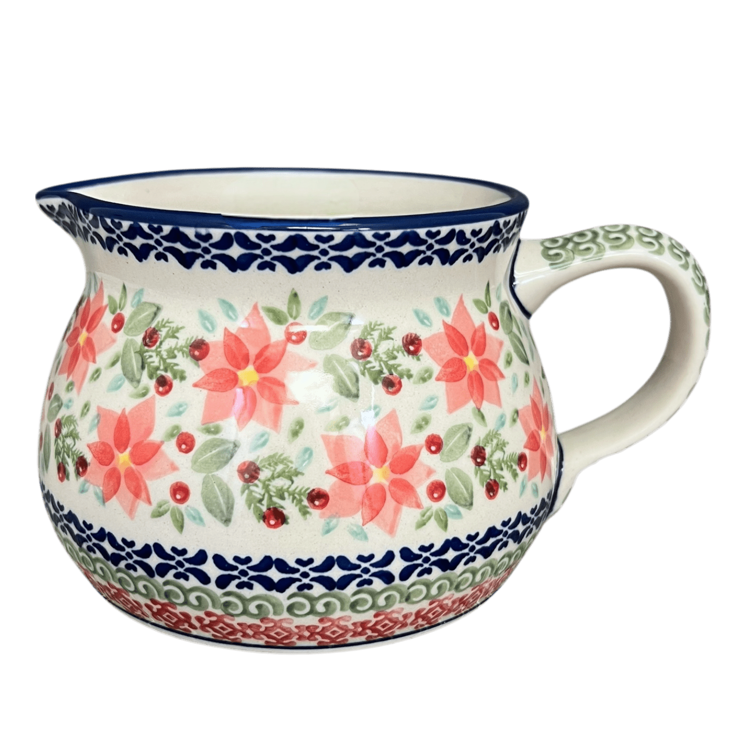 The "Pink Poinsettia" design wraps this functional art piece in a festive embrace of pink flowers, red berries, and lush green leaves, all set against a backdrop of harmonious green, red, and blue shapes. This pitcher isn't just about utility—it's a showcase of master craftsmanship. Each piece is a canvas where top-tier artists from Manufaktura have poured their hearts into creating intricate, signature patterns. These unique designs not only enhance your home decor but also stand as a testament to the artistry of Polish pottery, making each pitcher a collectible treasure marked with the exclusive "UNIKAT" stamp and the artist's own signature.