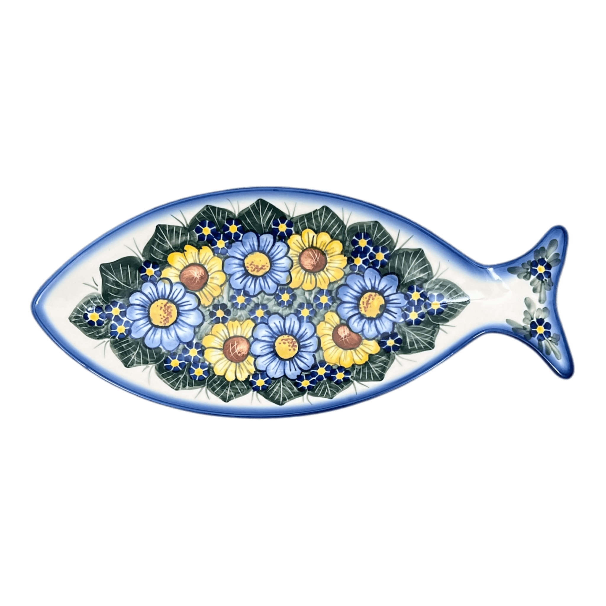 Plate, Fish-Shaped, 14.5" x 6.5", WR (WR13O) in "Bed of Blossoms" by W.R. Ceramika | WR13O-KG2 is backordered and will ship as soon as it is back in stock.