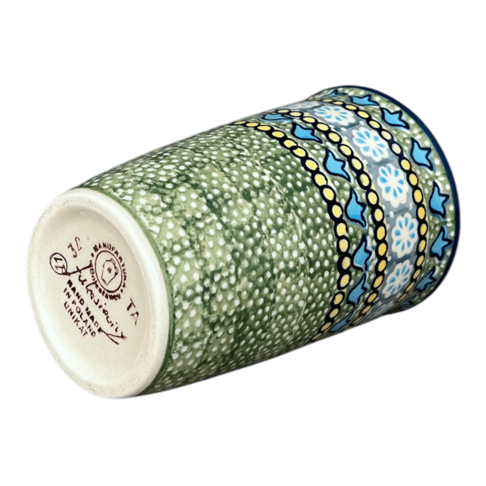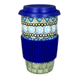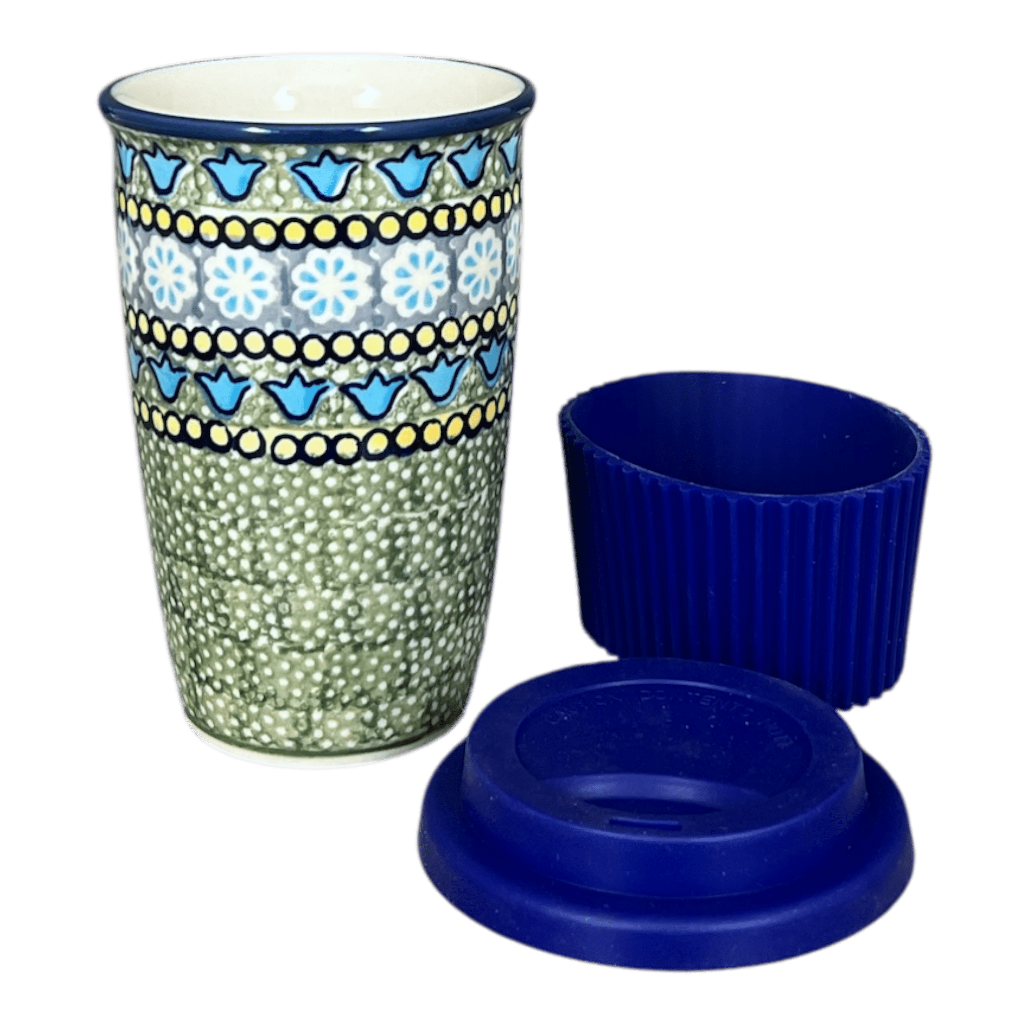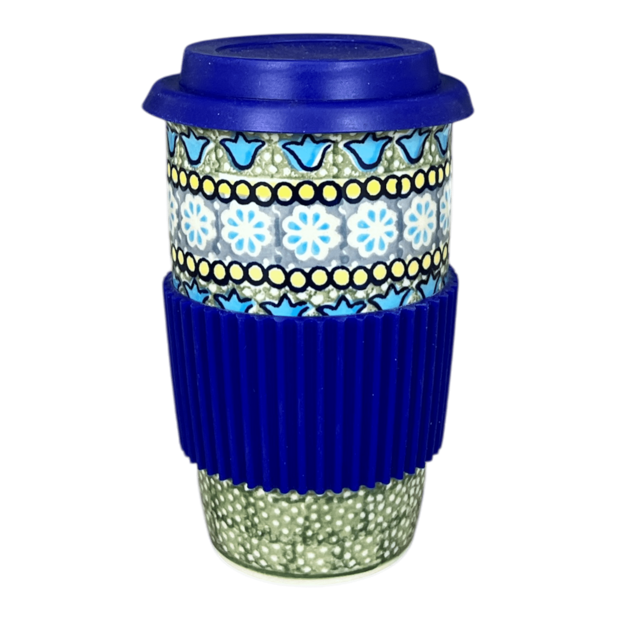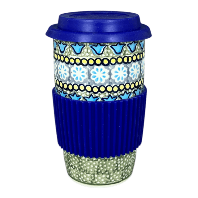 Introducing the Polish Pottery 14 oz. Travel Mug by Manufaktura in the captivating "Blue Bells" pattern (KLDN). Say goodbye to boring travel mugs and hello to a burst of color and style! Take your love for Polish pottery on the road with these beautiful travel mugs, each one carefully crafted with a silicone lid and sleeve. But here's the best part - remove these accessories and voila! You have a gorgeous tumbler or drinking glass that is perfect for everyday use.