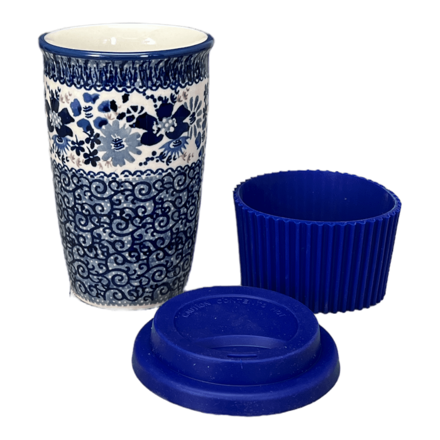 Introducing the Polish Pottery 14 oz. Travel Mug by Manufaktura in the captivating "Blue Life" pattern (EO39). Are you tired of boring travel mugs that lack personality? Well, we have the solution for you! Take your Polish pottery on the road with these beautiful travel mugs that are sure to turn heads wherever you go. Not only are they practical, but they also come with a silicone lid and sleeve for added convenience.