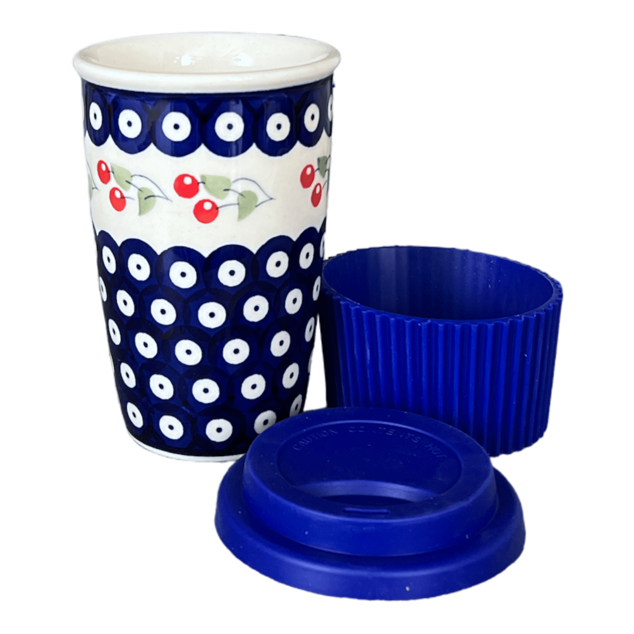 Embark on your daily journeys with a splash of artistry and practicality! Introducing the Polish Pottery Mug - Travel edition, crafted by the renowned artisans of Manufaktura in the vibrant "Cherry Dot" pattern (70WI). This 14 oz marvel isn't just a mug; it's a versatile companion that transforms from a travel mug with a handy silicone lid and sleeve to an elegant tumbler or drinking glass, perfect for home use. Whether you're navigating the bustling city streets or enjoying a quiet morning at home, this mug is your steadfast companion, ensuring your beverages are stylishly secured.