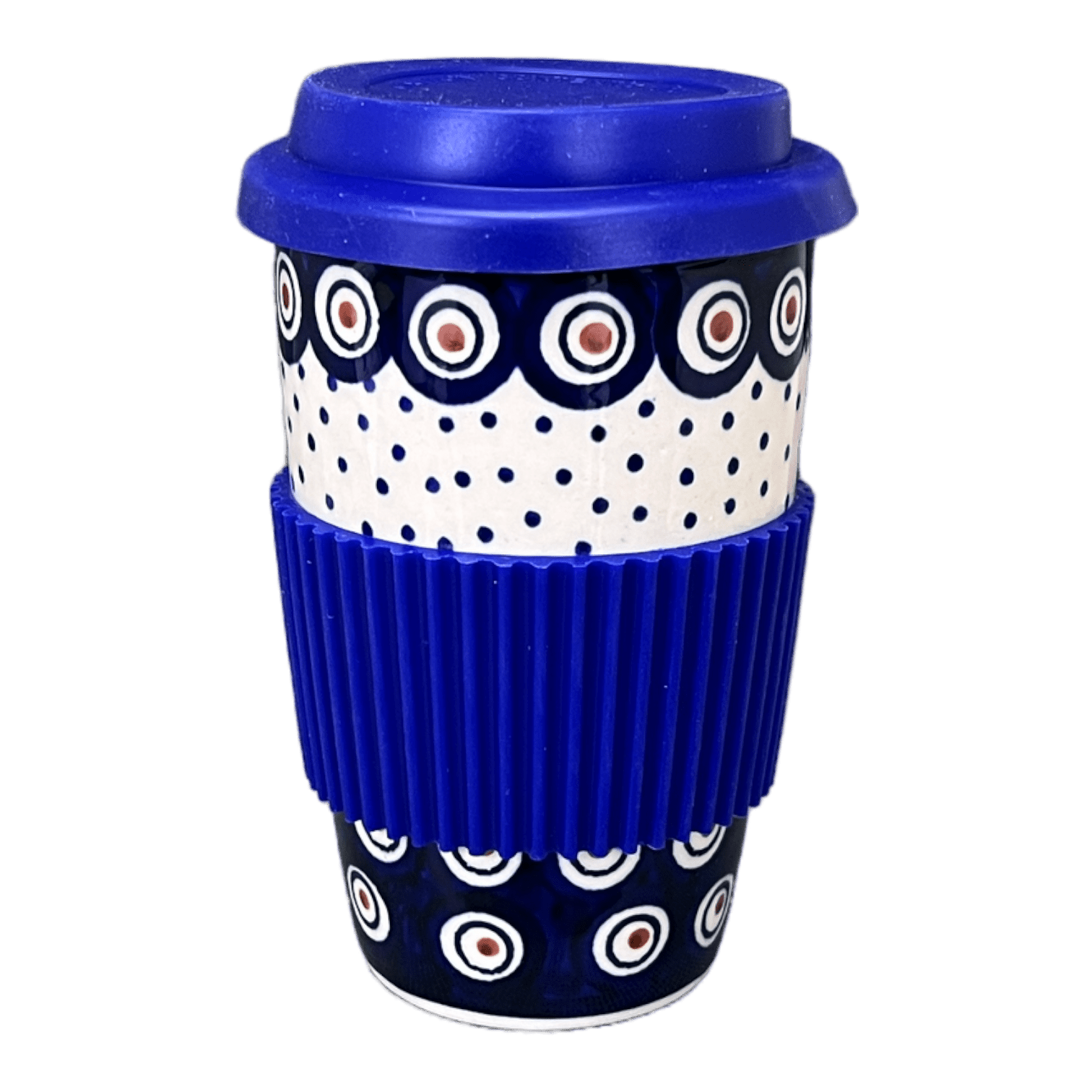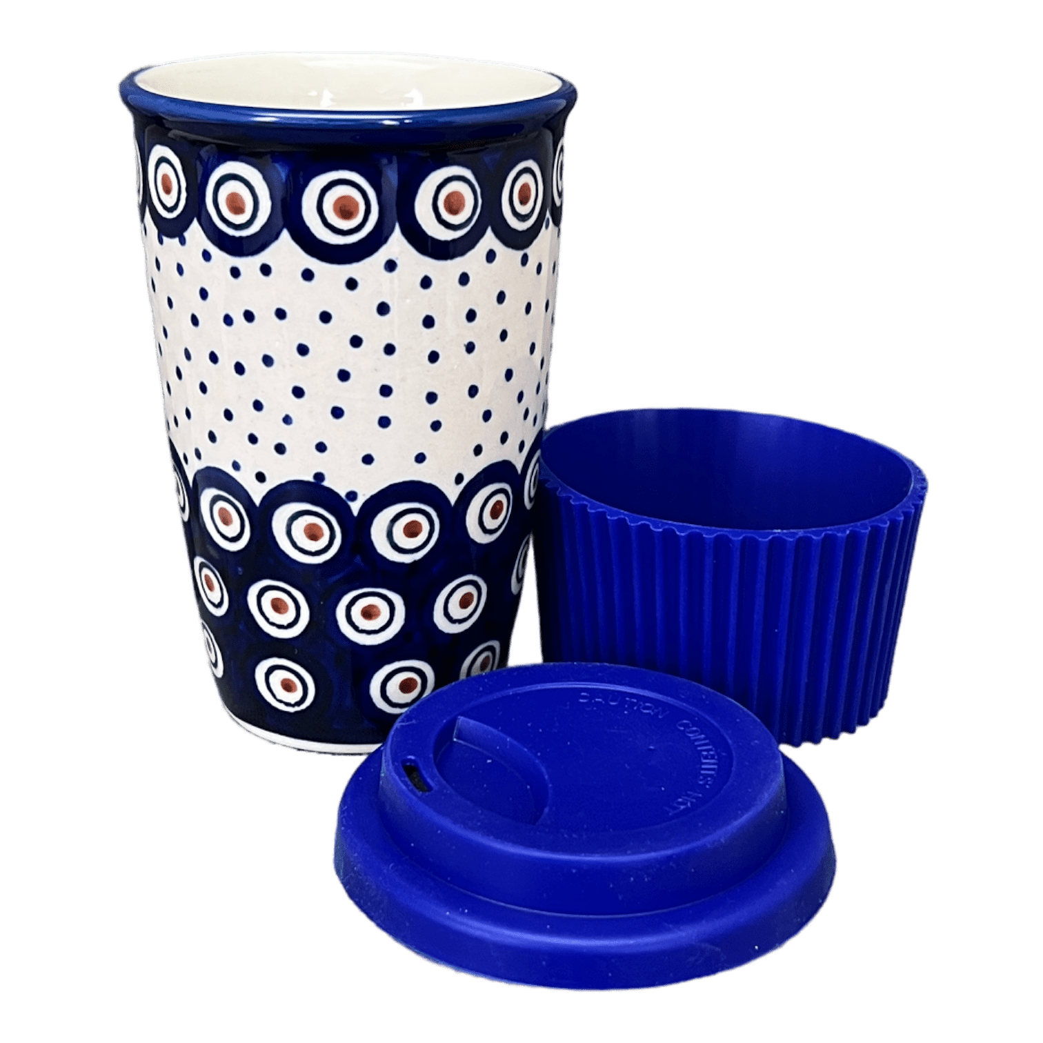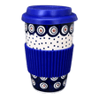 Introducing the Polish Pottery 14 oz. Travel Mug by Manufaktura in the stunning "Peacock Dot" pattern! If you're a lover of Polish pottery, now you can take it on the road with these beautiful travel mugs. But wait, there's more! Each mug comes with a silicone lid and sleeve, making it the perfect companion for your morning commute or outdoor adventures.