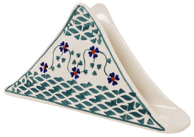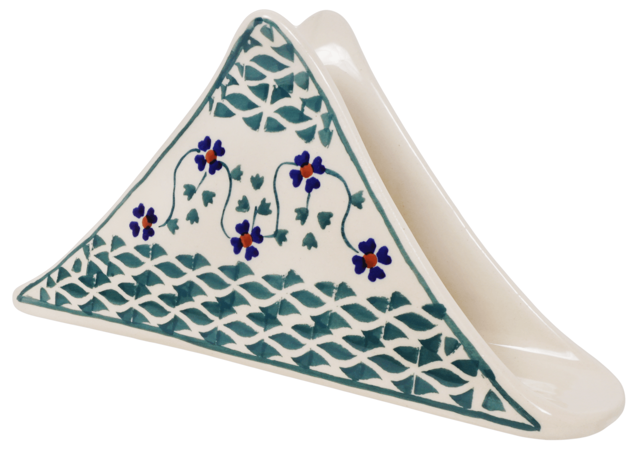 The "Woven Pansies" pattern features a delightful dance of colors with a white background harmoniously intertwined with green weaving at the center, bordered by a thin band of simple blue and orange flowers connected by a delicate green vine. Tiny groups of three green leaves sprout from the flowers, adding a touch of nature's serenity. Crafted using the age-old "punching" technique, skilled artisans hand-stamp each design, making every napkin holder a unique piece of art. Although considered "simpler" in the realm of Polish pottery patterns, the Traditional level of artistry displayed in this pattern is both iconic and warmly familiar, perfect for adding a homely touch to any interior.