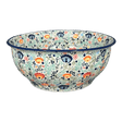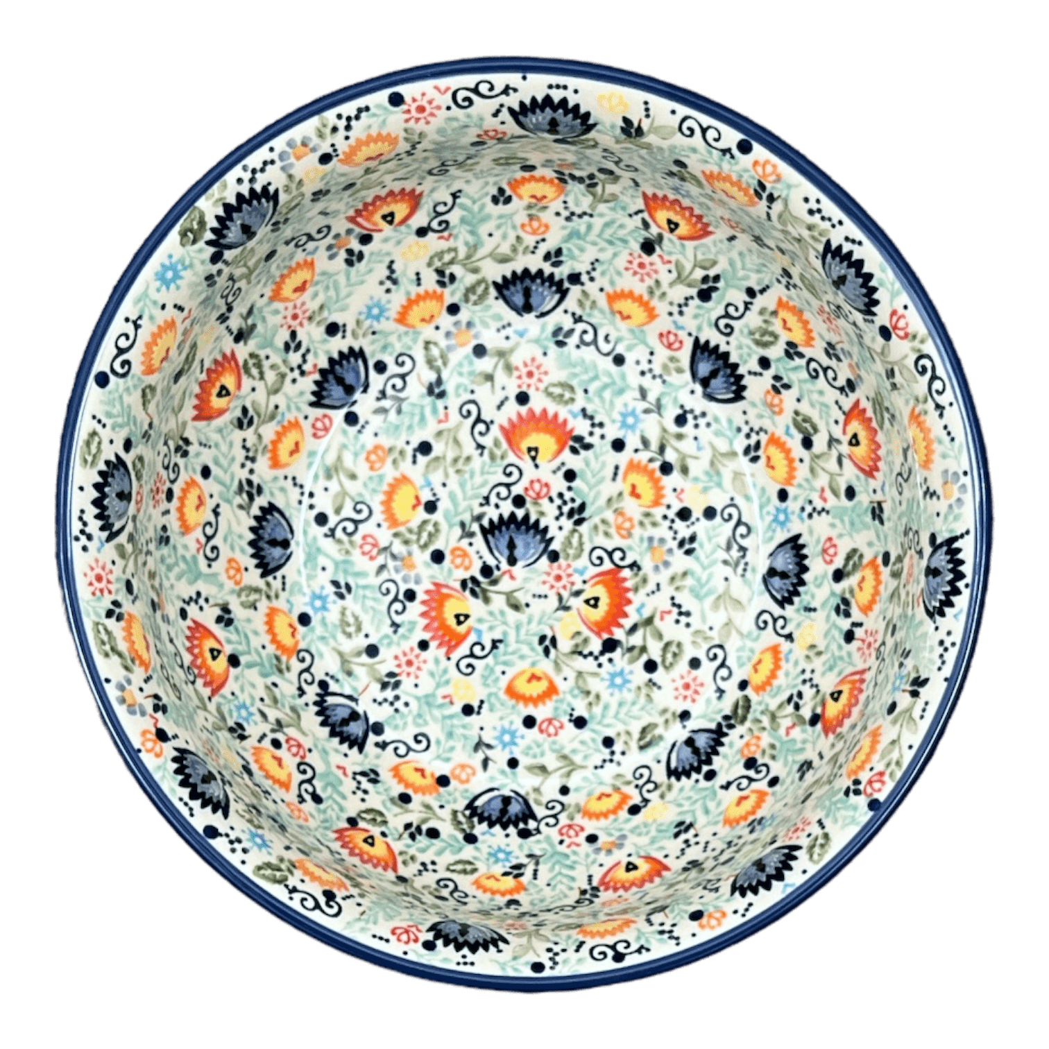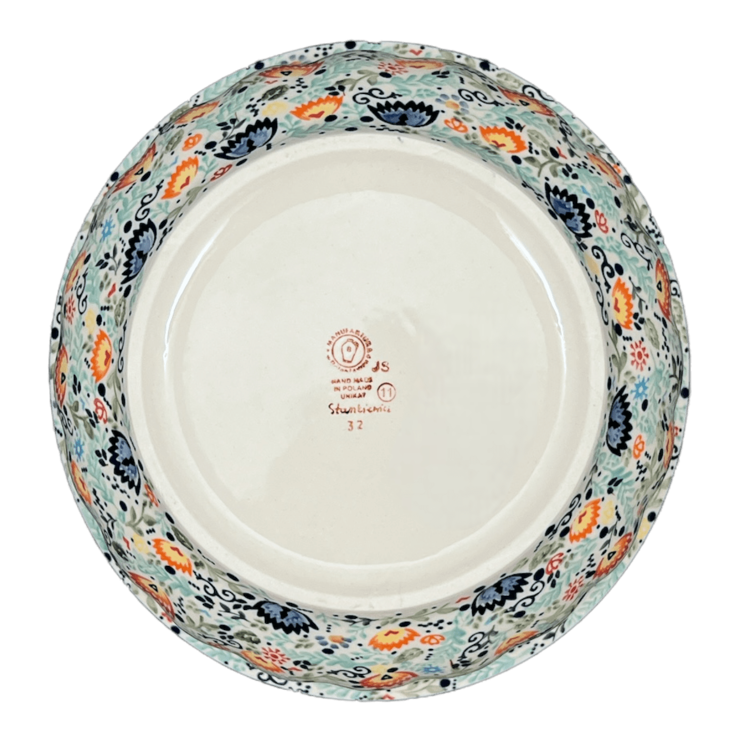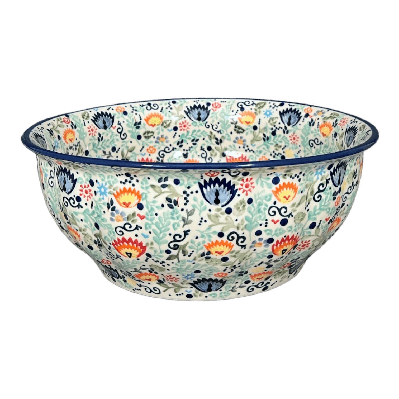 Step into a world of vibrant colors and exquisite artistry with the Manufaktura 11" Polish Pottery Bowl, a masterpiece from the heart of Boleslawiec, Poland. Adorned with the captivating "Fantasia" pattern, this bowl is not just a vessel but a canvas showcasing the exceptional skill of Manufaktura's artists. Picture the vivid orange and blue floral fans dancing across a lively green background, each detail meticulously hand-painted. Colbalt blue dots and delicate greenery scatter throughout, framed by a striking cobalt blue rim. This piece isn't just for serving; it's for celebrating the rich tradition of Polish craftsmanship at your dinner table!