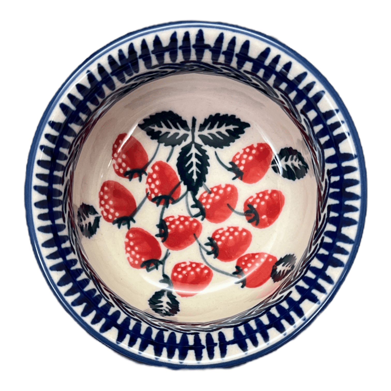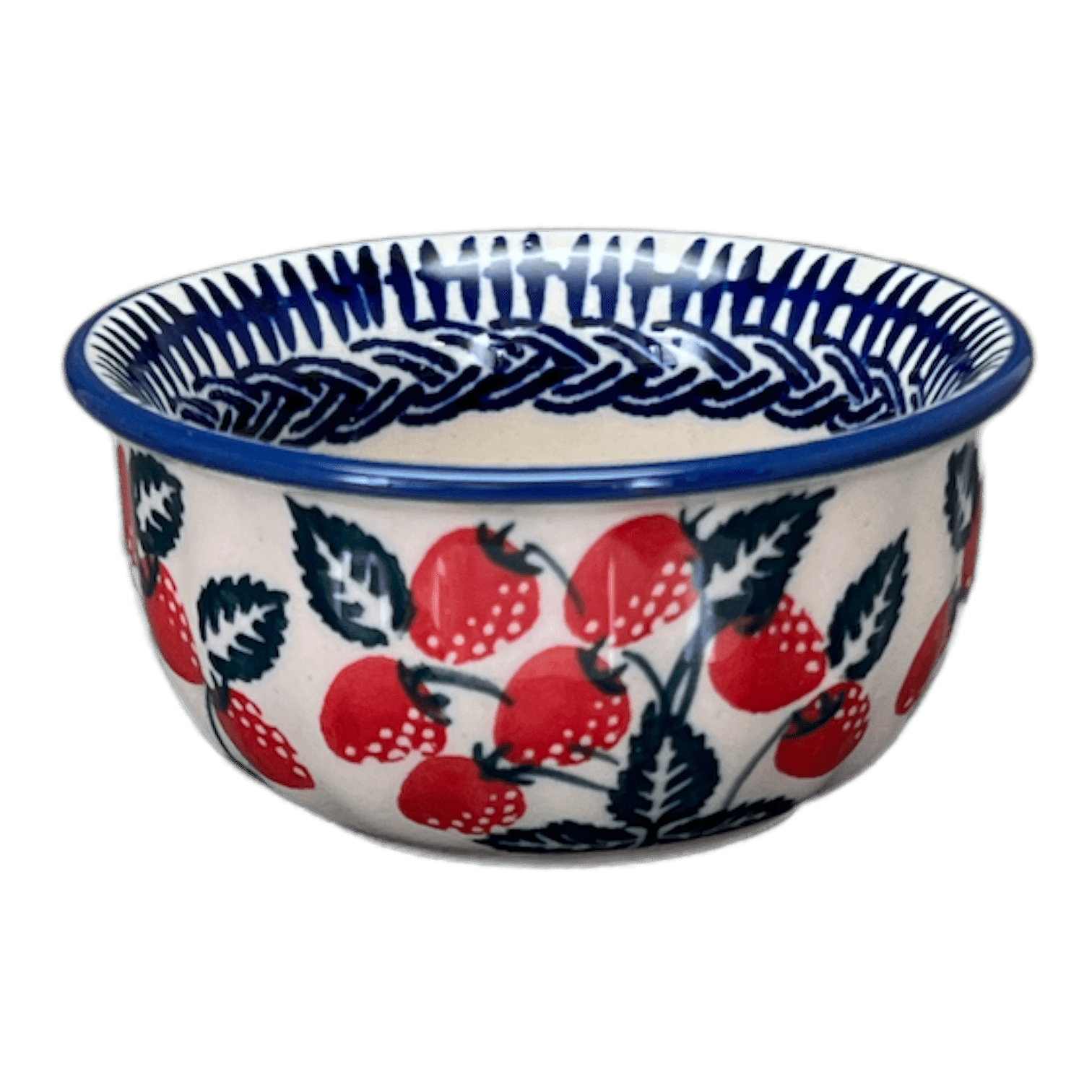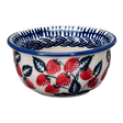 Introducing the stunning Polish Pottery 3.5" Bowl by Manufaktura in the delightful "Fresh Strawberries" pattern (AS70). This bowl is not only perfect as a ramekin or dipping bowl, but it also adds a touch of elegance to any table setting. The "Fresh Strawberries" pattern features charming design elements incorporating luscious strawberries in a vibrant red color, with accents in green, blue, and white. It's a feast for the eyes!