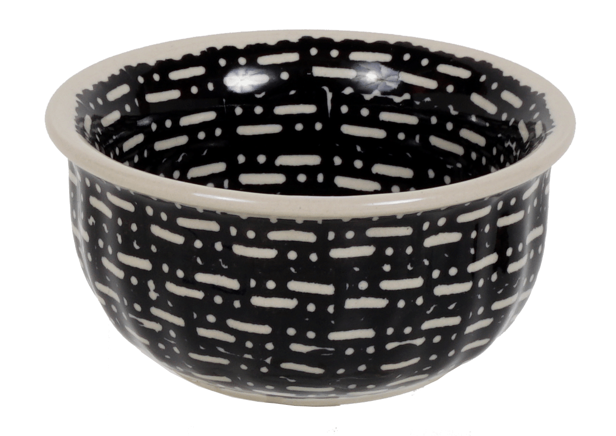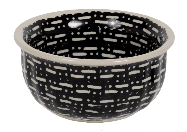 Introducing the Polish Pottery 3.5" Bowl by Manufaktura in the captivating "Metro" pattern (WCZM). This versatile bowl is not only perfect as a ramekin or dipping bowl, but it also adds a touch of elegance to any table setting. The "Metro" pattern features a striking combination of black and white, with design elements that incorporate simplicity in the most captivating way. The black background is adorned with tiny white dashes and dots, creating a mesmerizing visual effect that is sure to catch the eye.