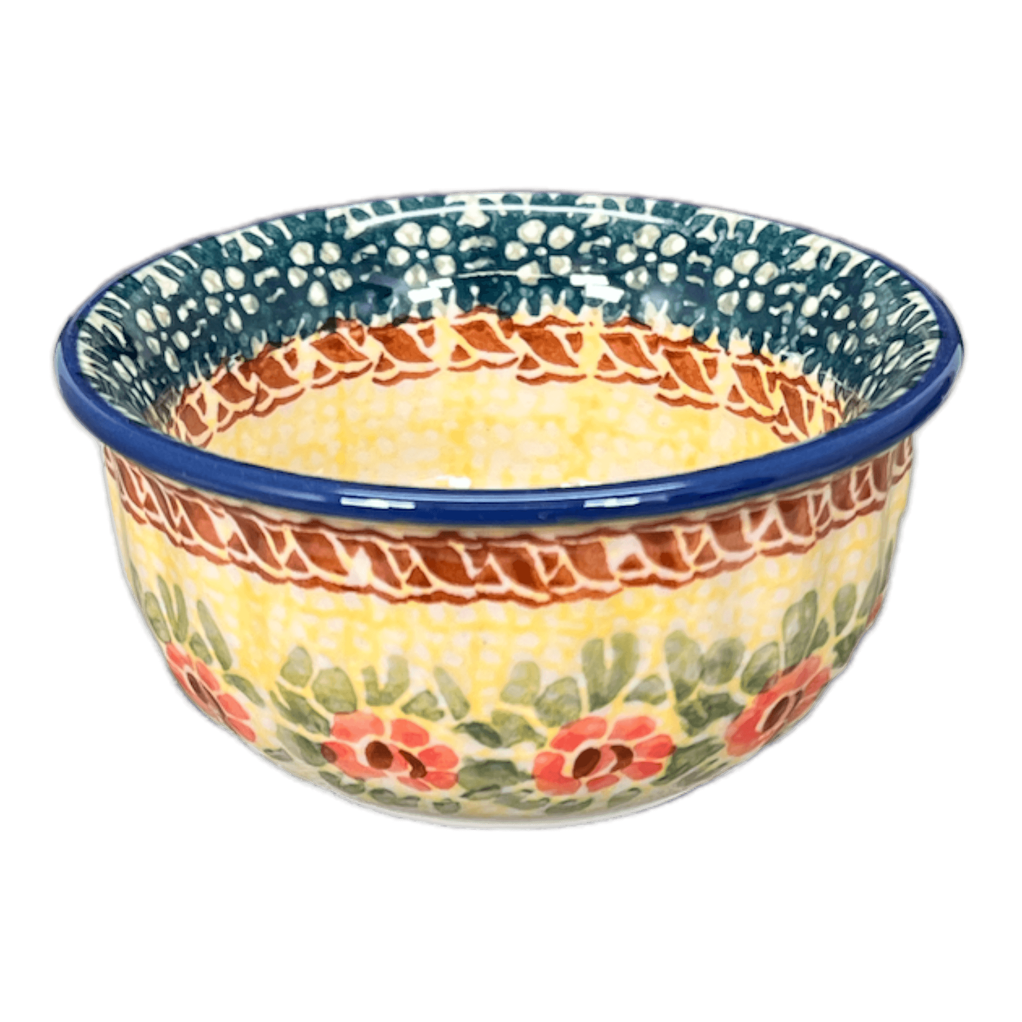 Introducing the enchanting Manufaktura Polish Pottery Bowl, a masterpiece from the heart of Boleslawiec, Poland. This delightful 3.5" round bowl is not just any ordinary dish; it's a canvas painted with the vibrant "Bountiful Blossoms" pattern. Imagine a dance of flowers in hues of green, yellow, orange, and brown, each brushstroke meticulously hand-painted by the finest artisans. The bowl's design is further enhanced by its gently scalloped edges, giving it a touch of elegance that makes it perfect for serving dips or using as a charming ramekin.