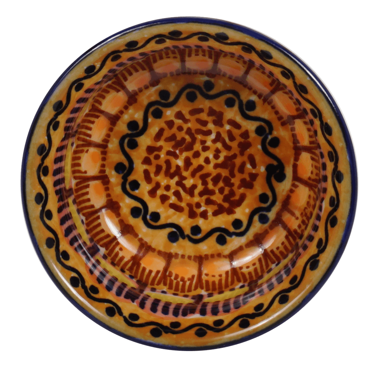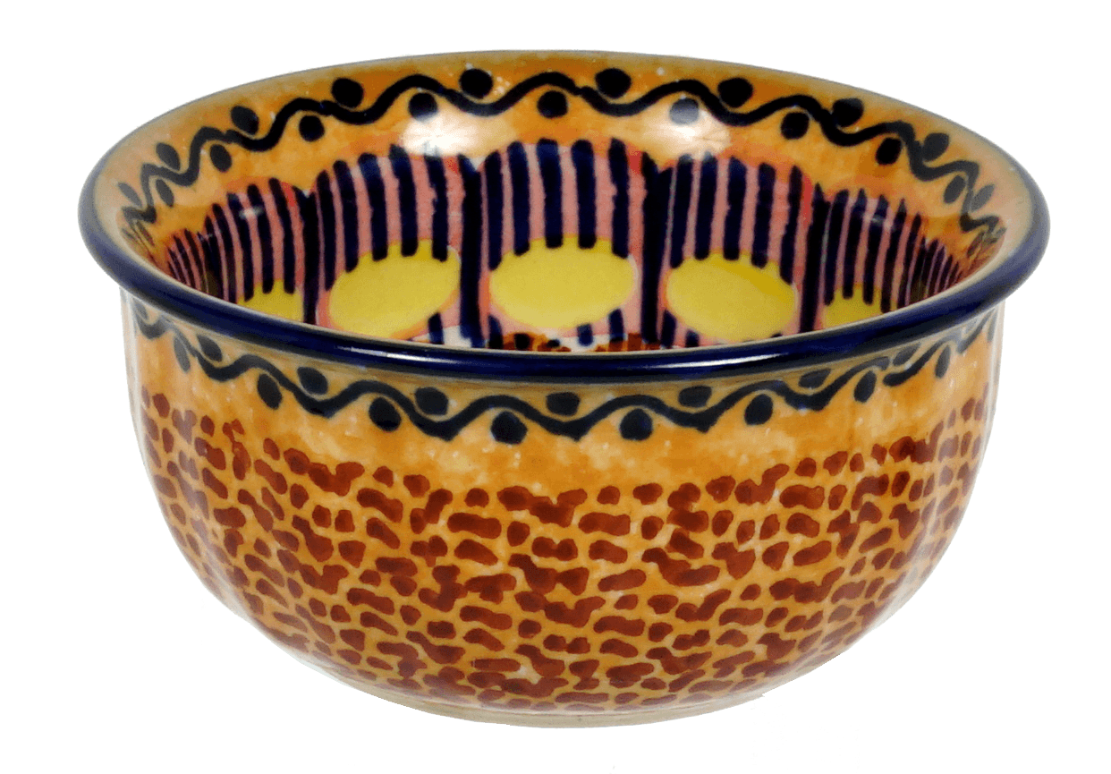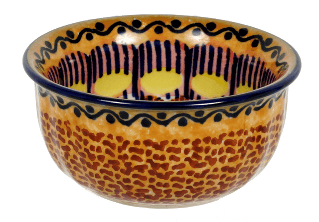 Introducing the Polish Pottery 3.5" Bowl by Manufaktura in the captivating "Desert Sunrise" pattern (KLJ). This bowl is not just your ordinary dishware; it is a piece of art that will elevate your dining experience to a whole new level. The "Desert Sunrise" pattern boasts a mesmerizing combination of geometric shapes in rich brown, vibrant orange, and bold blue and yellow accents. It's like having a burst of sunshine right at your table!