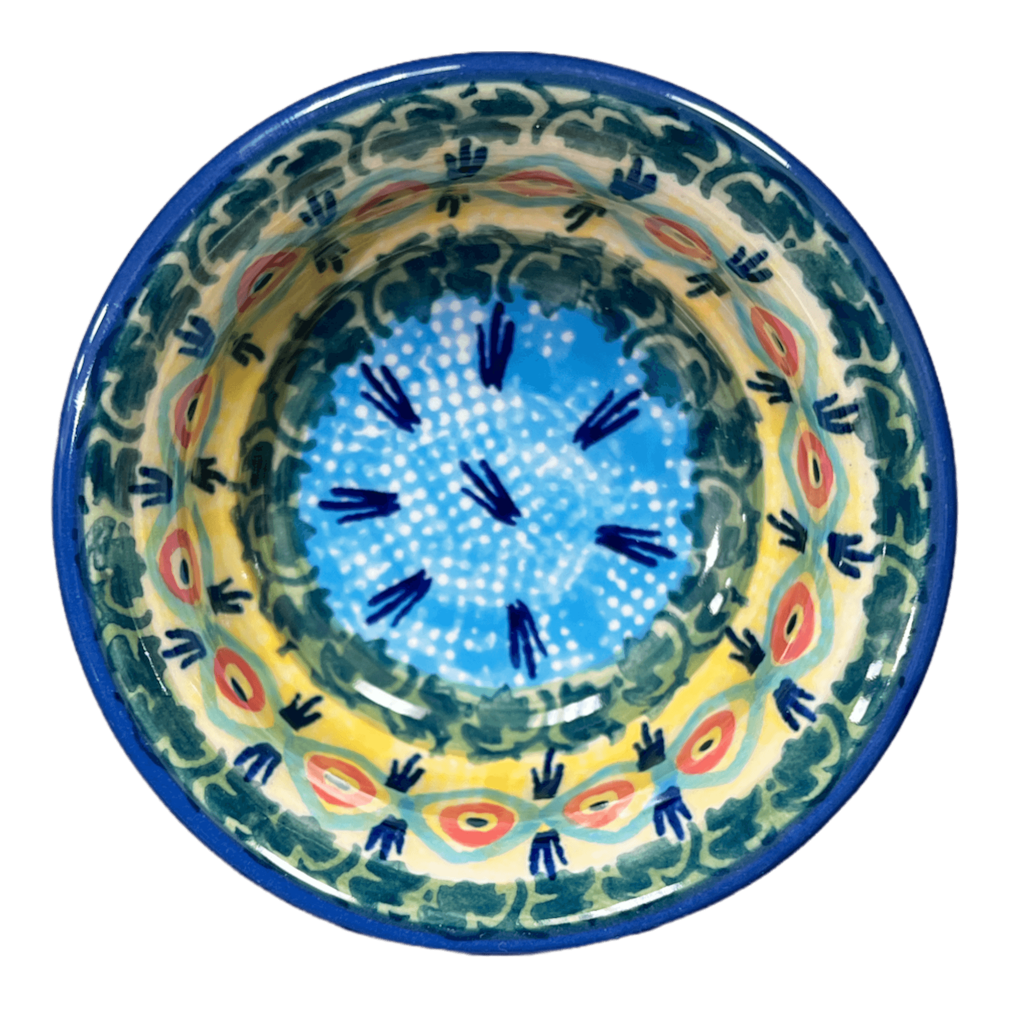 Introducing the Polish Pottery 3.5" Bowl by Manufaktura in the captivating "Providence" pattern (WKON). This little bowl is not only perfect as a ramekin or dipping bowl, but it also boasts a mesmerizing design that will add a touch of elegance to your table. The "Providence" pattern features a stunning combination of peacock motifs in a predominantly light blue color, with vibrant accents in yellow and green. It's like having a piece of art right at your fingertips!