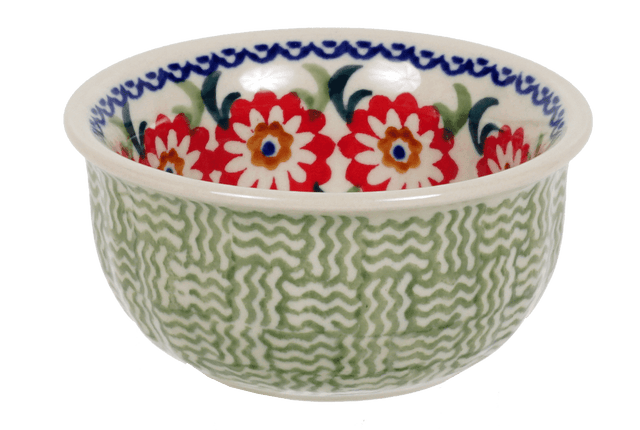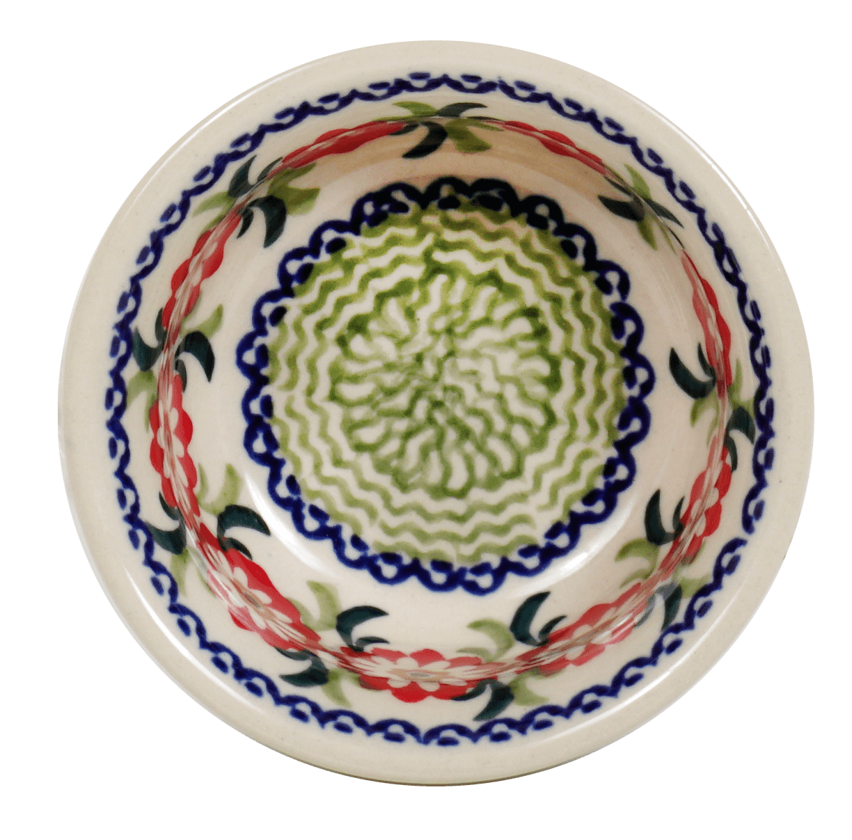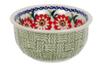 The "Woven Reds" design is a visual feast, adorned with a lush tapestry of green and white patterns at the center, encircled by a garland of large, simple red flowers interspersed with petite teal and green leaves. This traditional pattern, achieved through the meticulous "punching" technique of hand stamping, showcases the high level of artistry that Polish pottery is renowned for. Despite being labeled as a 'simpler' design, the vibrant, nature-inspired motifs carry a depth of character and uniqueness, as different artisans bring their personal touch to each piece. This means that no two bowls are exactly alike, each one a unique artifact of cultural craftsmanship.