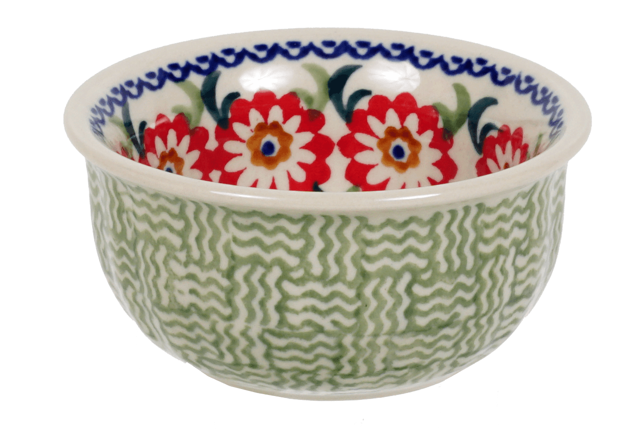 Imagine a tiny masterpiece that can transform your table setting with a splash of vibrant colors and exquisite patterns. Introducing the Polish Pottery Bowl from Manufaktura, a charming 3.5" round bowl in the captivating "Woven Reds" pattern (P181). This delightful piece doubles perfectly as a ramekin or dipping bowl, making it a versatile addition to your culinary collection. Crafted in the heart of Boleslawiec, Poland, by skilled artisans, each bowl features slightly scalloped indentations along the sides, adding a touch of elegance to its robust charm.