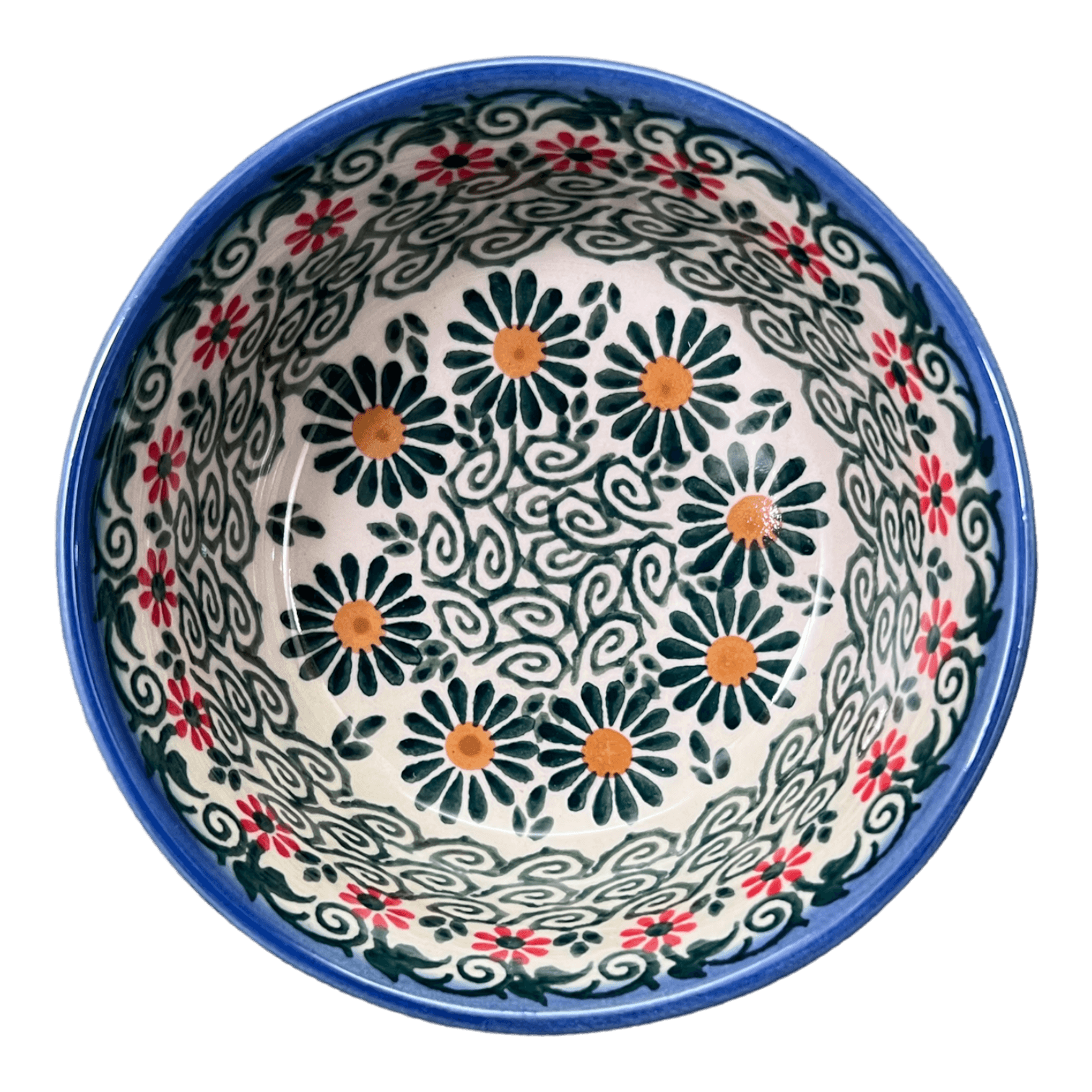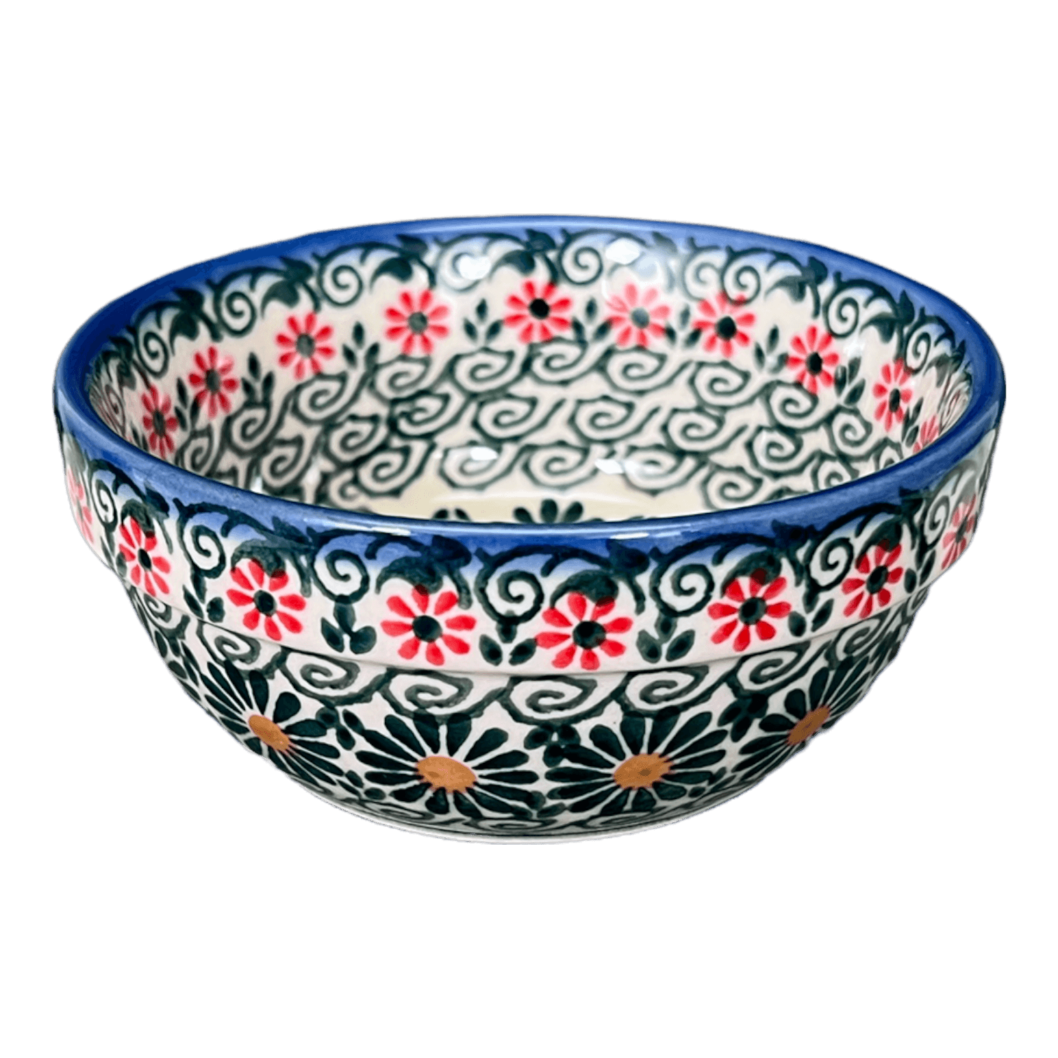 Imagine a delightful splash of nature right in your kitchen with the Polish Pottery Bowl by Andy, featuring the enchanting "Garden Breeze" pattern. This charming 4.25-inch bowl is a small wonder, perfect for serving your favorite dips, salsa, or creamy hummus. Adorned with large green flowers boasting golden centers and surrounded by a lush array of green leaves, vines, and delicate swirls, it also showcases petite pink flowers that add a whimsical touch. Each bowl is a canvas painted with the vibrant hues of a garden in full bloom, inviting a piece of the great outdoors into your home.