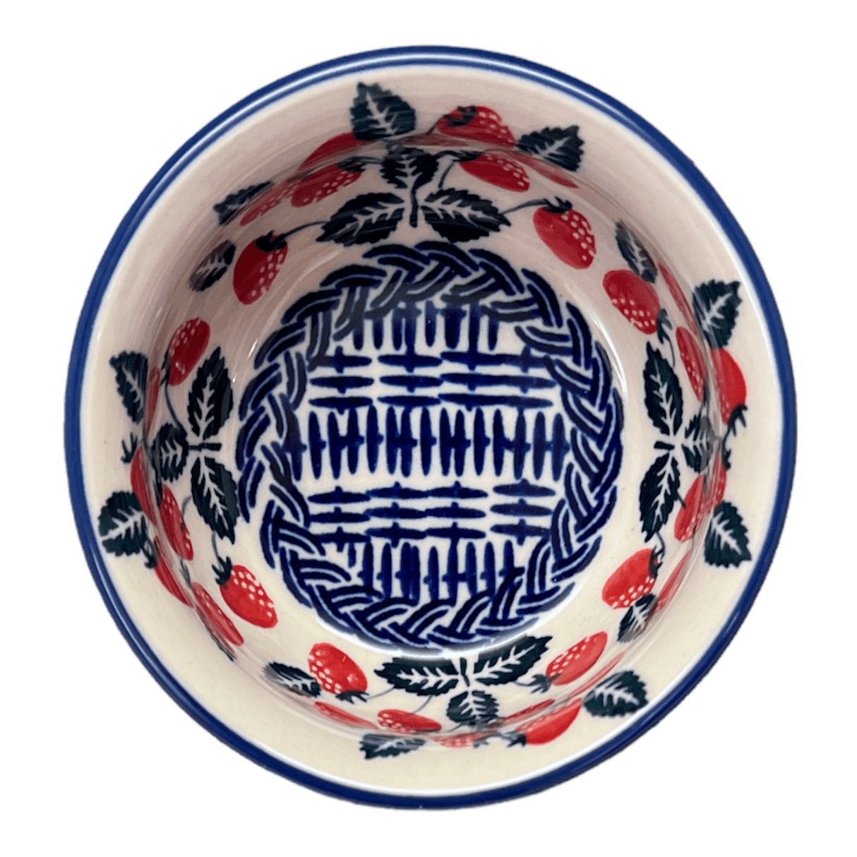 The "Fresh Strawberries" pattern is a true feast for the eyes. With its vibrant red background and playful accents in green and blue, it brings to mind sunny summer days and juicy strawberries picked straight from the garden. Hand-painted by skilled artisans in Boleslawiec, Poland, this bowl is a testament to the rich tradition of Polish pottery.