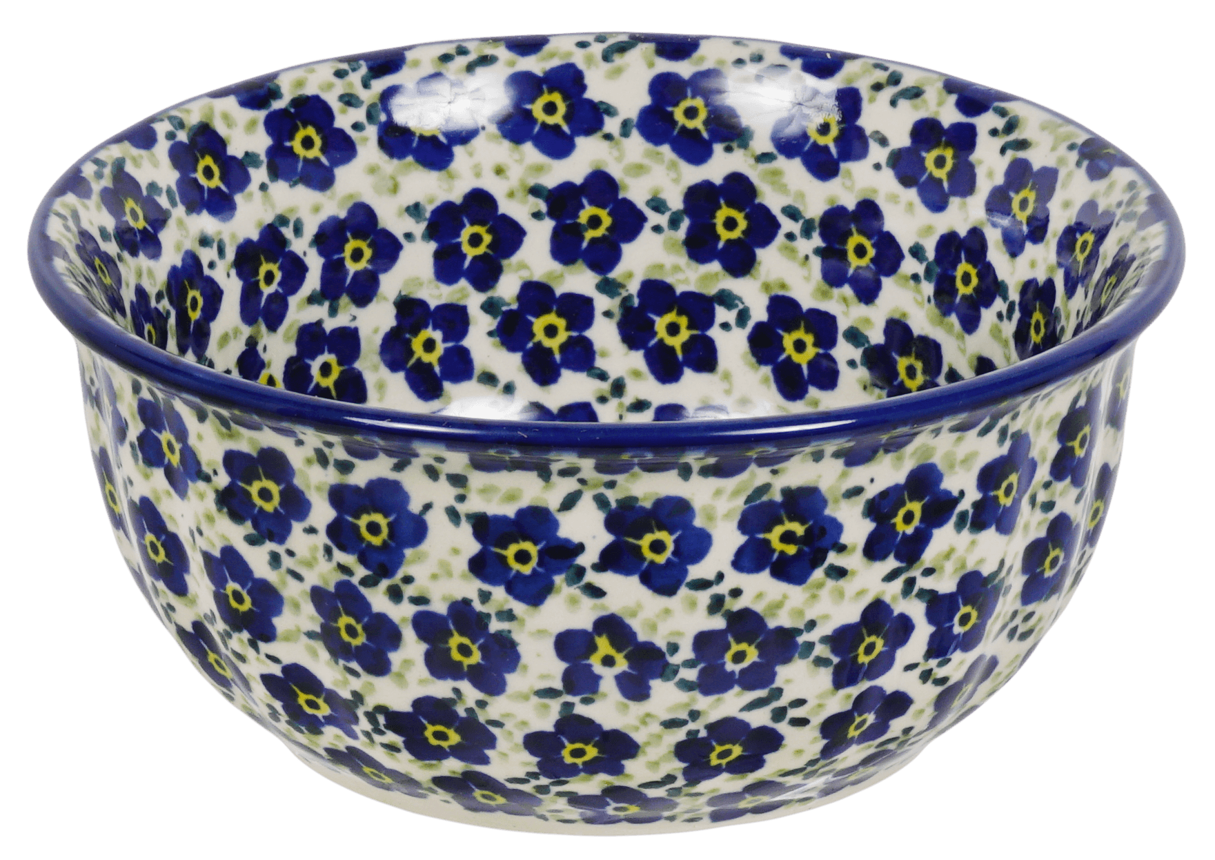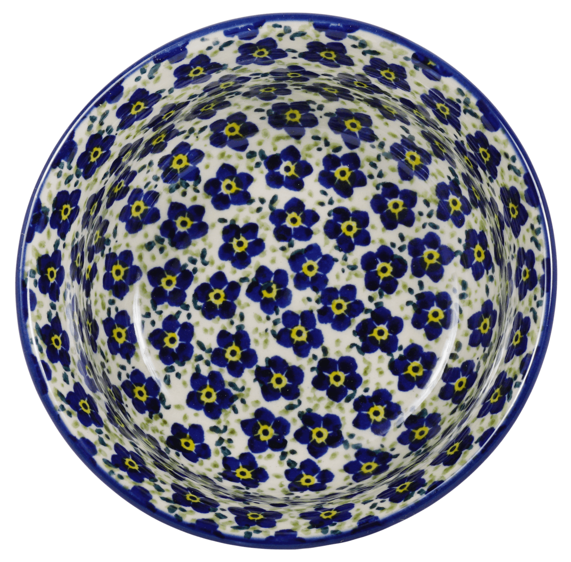 Immerse yourself in the enchanting world of Polish Pottery with this exquisite 5.5" bowl from Manufaktura, adorned with the vibrant "Floral Revival Blue" pattern. Perfect for brightening up your daily meals, this versatile bowl is ideal for everything from steaming soups to refreshing salads, delectable desserts, or your morning cereal. Each piece is a canvas of predominantly blue hues, complemented by cheerful green, yellow, and white accents, bringing a burst of color and elegance to your table. The delightful design features tiny teal green leaves and charming blue and yellow flowers, gracefully scattered across a pristine white background, transforming every meal into a festive feast.