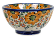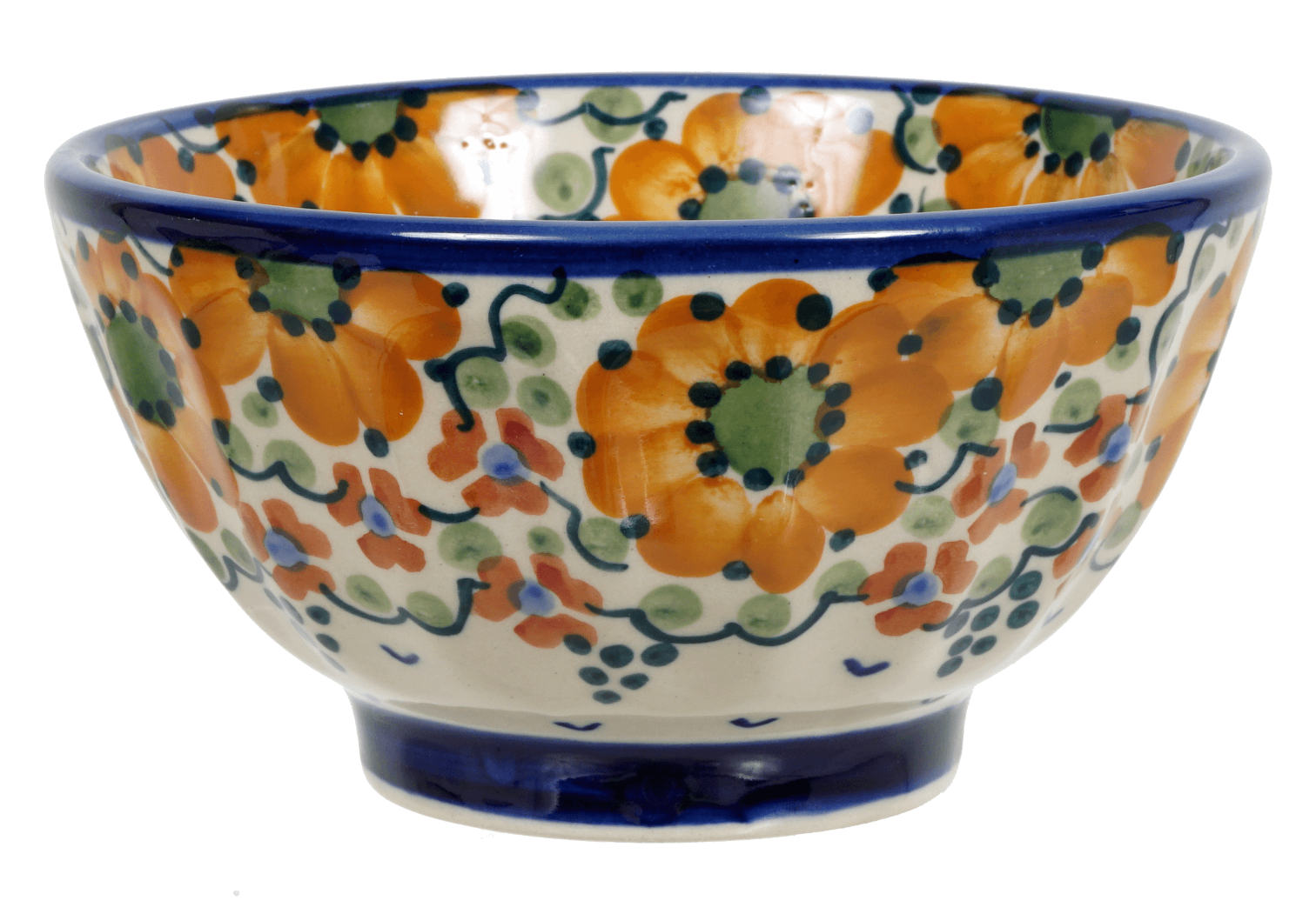 Imagine a delightful ensemble on your dining table, with the centerpiece being the exquisite Polish Pottery Bowl from Manufaktura. This isn't just any bowl; it's a canvas of vibrant autumn colors captured in the "Autumn Harvest" pattern, featuring intricate designs of golden flowers with green and white accents, creating a feast for the eyes. Measuring 5.5 inches in diameter and standing 3 inches tall, this bowl perfectly cradles everything from your morning cereal to your late-night ice cream cravings. Its unique design, with a wide top and a graceful narrow pedestal, not only makes it a practical piece for various foods but also an elegant addition to any table setting.
