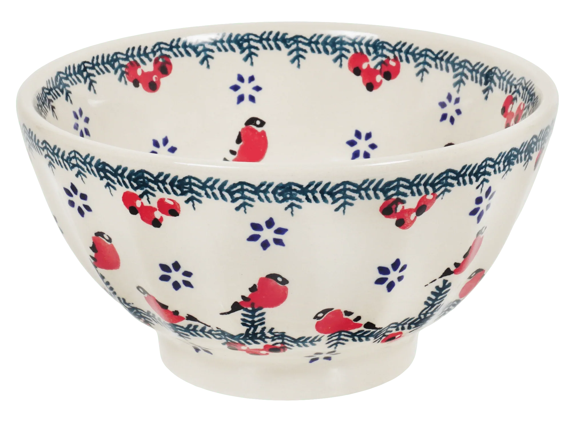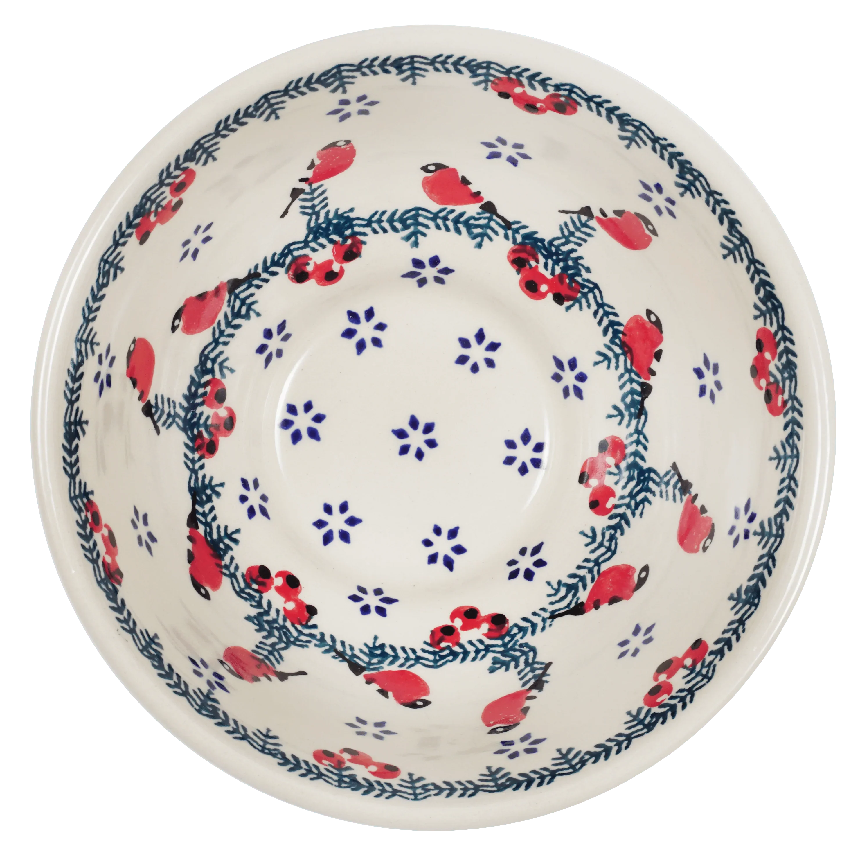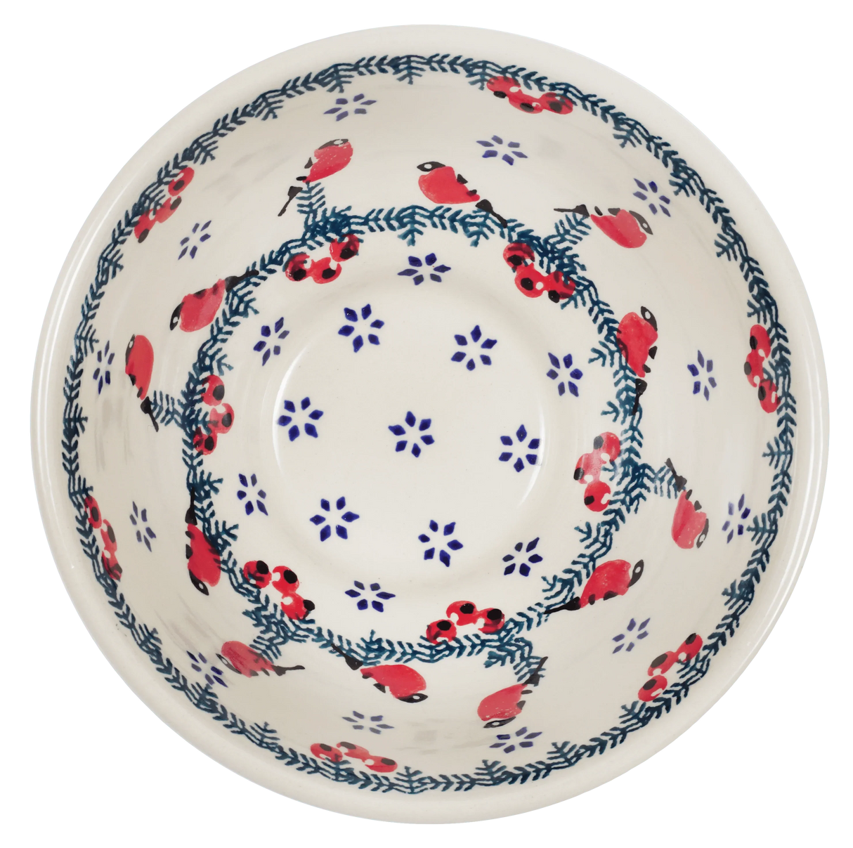 Step into a world of vibrant colors and timeless design with our exquisite Polish Pottery Bowl from Manufaktura, featuring the enchanting "Red Bird" pattern. Each bowl is a canvas of artistic tradition, painted with delightful red birds perched amidst a delicate evergreen wreath with festive red berries. Scattered blue snowflakes add a whimsical touch to the crisp white background, creating a perfect tableau for any table setting. Ideal for a variety of uses, from a hearty soup to a generous scoop of ice cream, these bowls are designed to make every meal memorable. Their unique wide-top design that tapers into a narrow pedestal adds an elegant flair, enhancing any dining experience.