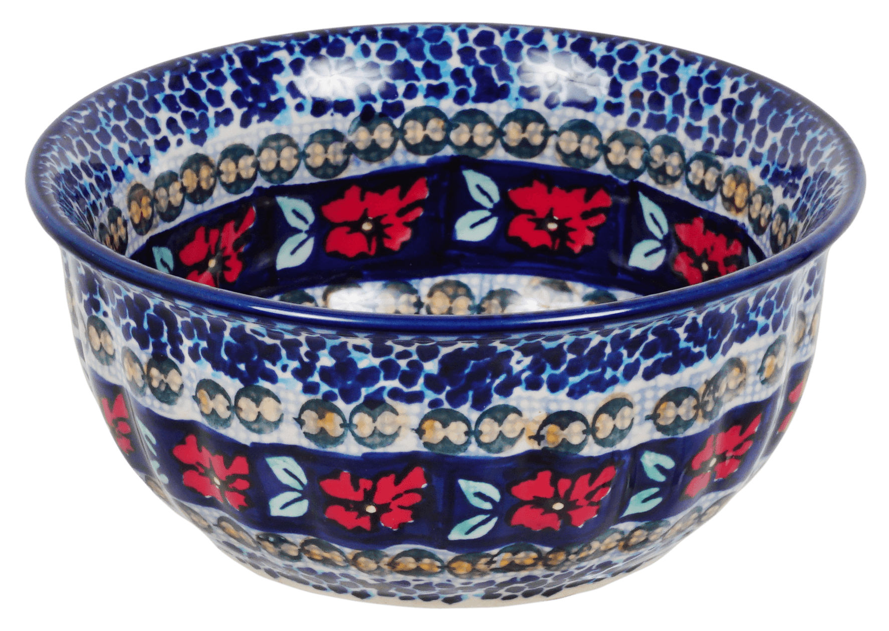 Imagine setting your table with a piece of art that not only captures the eye but also tells a story of exceptional craftsmanship. The Polish Pottery Bowl from Manufaktura, sized at a versatile 5.5 inches and adorned with the breathtaking "Crimson Twilight" pattern, does just that. Perfect for anything from a comforting soup to a refreshing salad, or even your morning cereal, this bowl transforms every meal into a special occasion. The "Crimson Twilight" pattern, a masterpiece of floral design on a serene light blue backdrop, is punctuated by vibrant blue dots and framed by a dance of red flowers and green leaves. It’s not just a bowl; it’s a gateway to an enchanted twilight garden.
