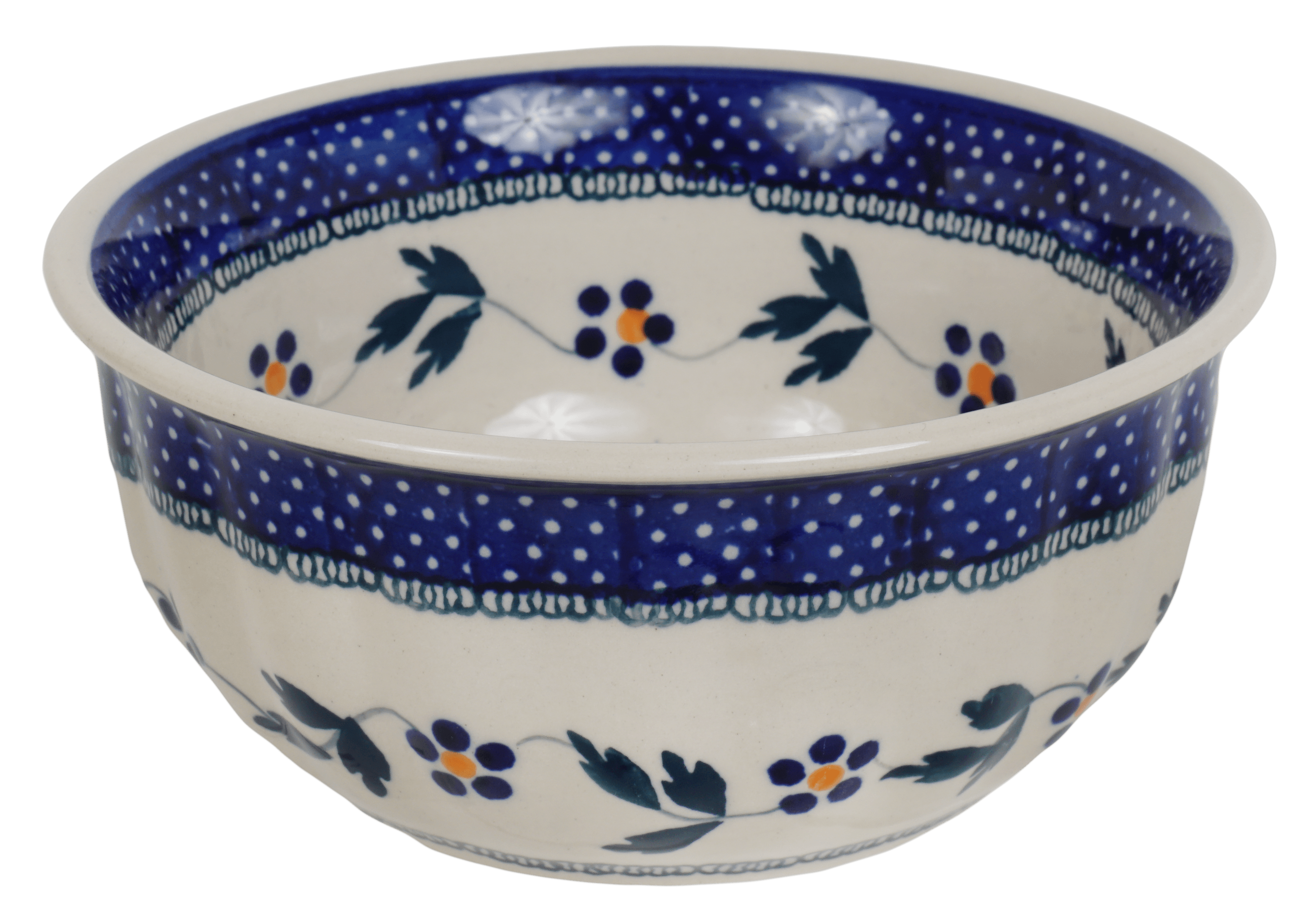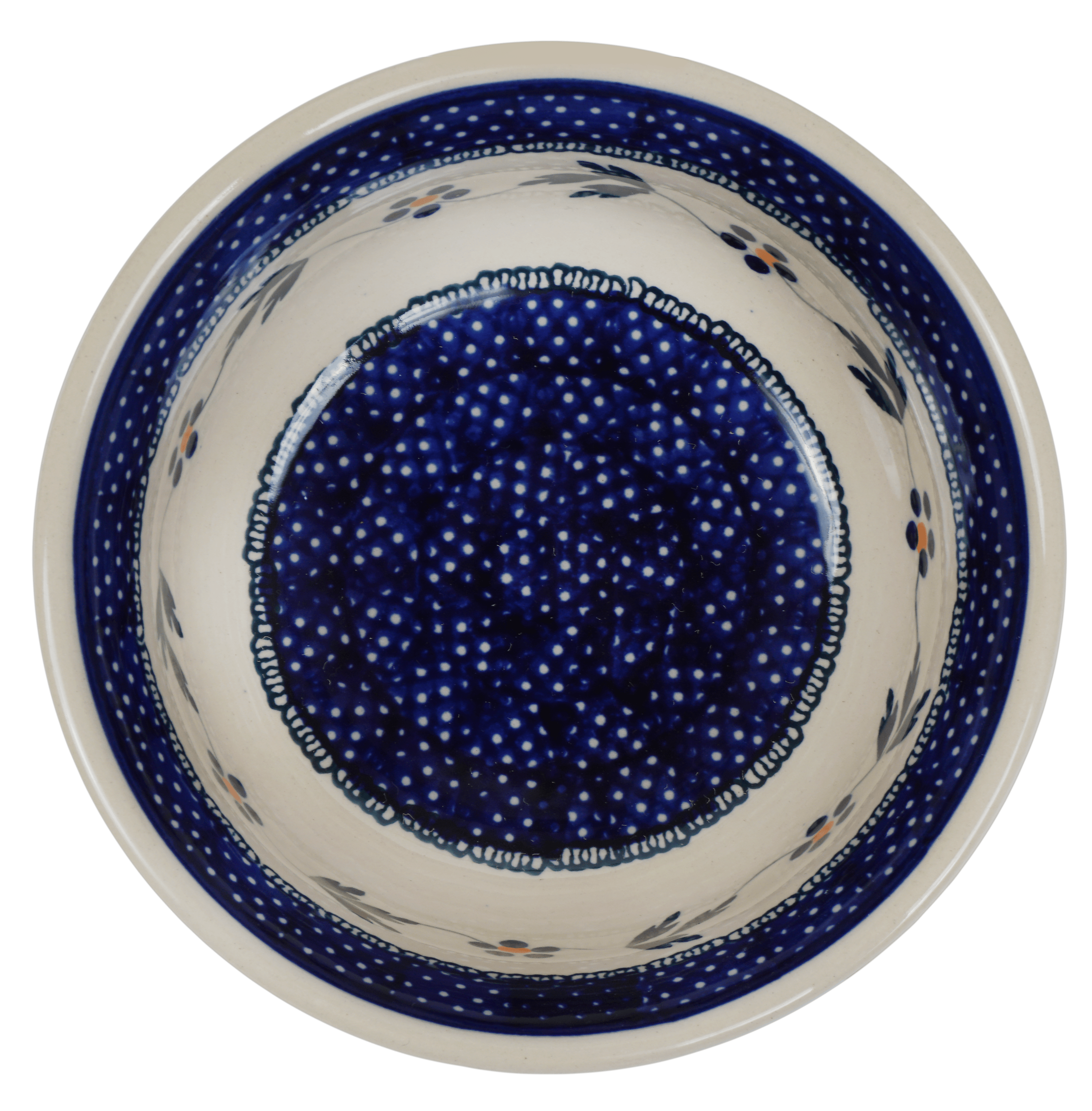 The "Morning Glory" pattern features delicate white dots against a rich blue background in the center, surrounded by simple dark blue and yellow flowers on a teal green vine against a crisp white background. It's a feast for the eyes and a true testament to the artistry of Polish pottery. In fact, this pattern is considered to be of Traditional level, making it one of the most common and recognizable patterns in the world of Polish pottery.