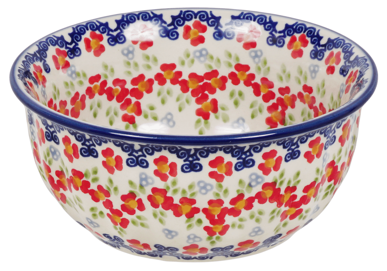 Imagine a bowl that does more than just hold your food; it tells a story. The Polish Pottery Bowl from Manufaktura, measuring a cozy 5.5 inches, is a masterpiece in the delightful "Ring Around the Rosie" pattern. Perfect for cradling your favorite soup, scooping up a refreshing salad, or indulging in a late-night ice cream treat, this bowl turns every meal into a vibrant festival of colors. With its predominant red flowers gracefully accented by hints of blue, white, and green, this design captures the essence of a breezy summer meadow right on your dining table.