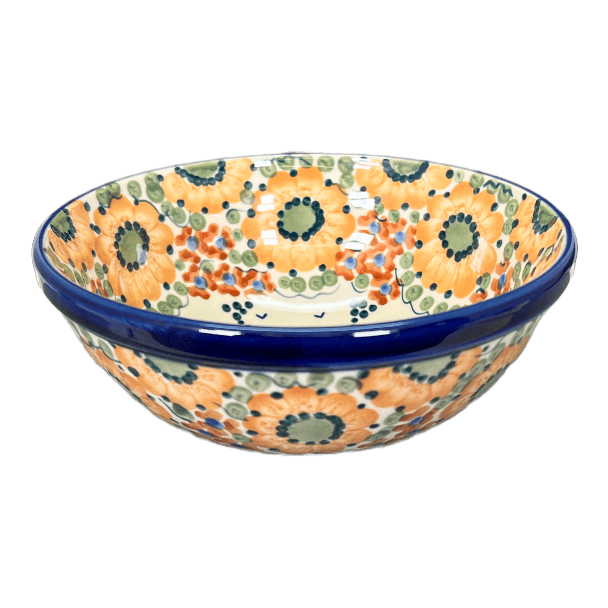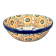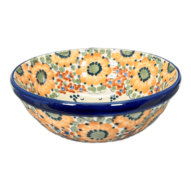Imagine setting your table with a piece that whispers tales of autumnal elegance and artful craftsmanship. The Polish Pottery Bowl from Manufaktura, in the stunning "Autumn Harvest" pattern, does just that. This 6.75" round bowl, painted by hand in Boleslawiec, Poland, brings a festive splash of color to any meal. Whether you're serving a hearty soup to warm a chilly evening, a fresh, crisp salad, or indulging in your favorite ice cream, this bowl turns every meal into a celebration. Its enchanting design features a white background dotted with playful blue circumflexes, simple brown flowers with charming blue centers, and a captivating band of large, detailed orange flowers with green centers—each detail contributing to a tapestry of color that captures the essence of autumn.