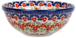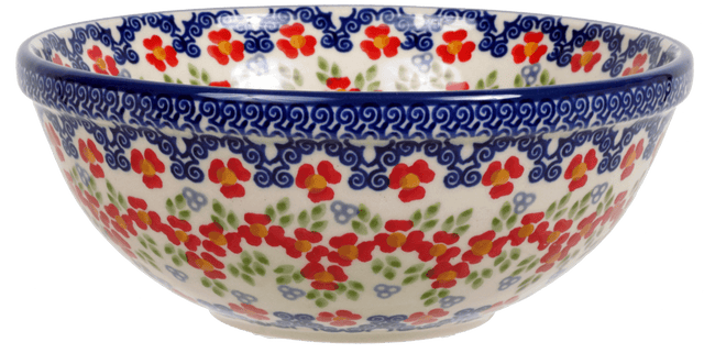 Step into a world of vibrant colors and exquisite craftsmanship with the Polish Pottery Bowl from Manufaktura. This charming 6.75" bowl, adorned with the delightful "Ring Around the Rosie" pattern, is a testament to the skilled artisans of Boleslawiec, Poland. Imagine starting your day with a cheerful bowl of cereal or winding down with a comforting soup, all served in a piece that's not just a bowl, but a work of art. The unique design features a white background with playful blue swirls and tiny green tufts of grass, encircled by a delicate chain of small red flowers, bringing a touch of Polish spring right to your table.