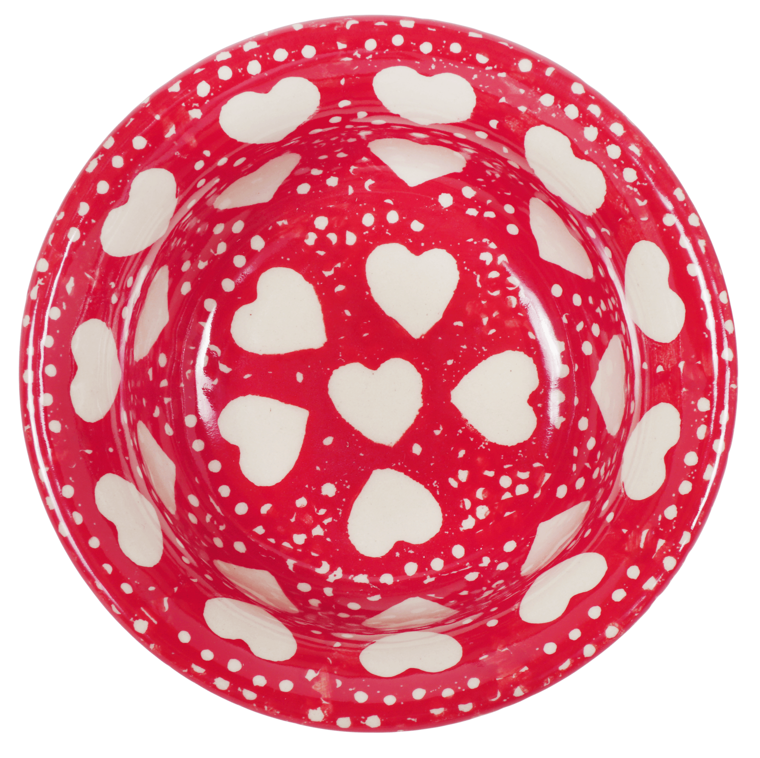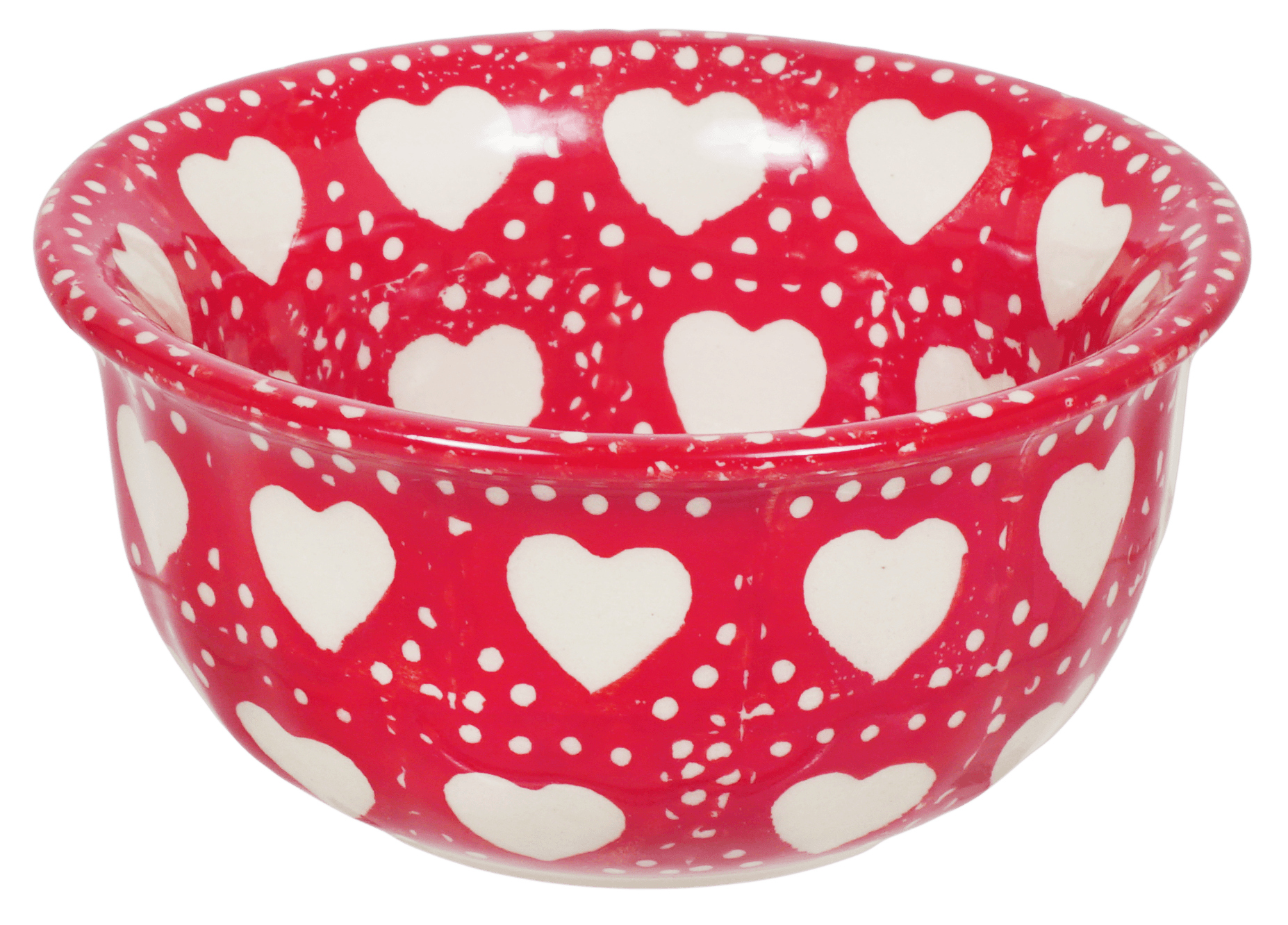 Step into a world where traditional craftsmanship meets vibrant design with the Polish Pottery Bowl from Manufaktura. Perfectly sized at 3.5 inches, this charming bowl is your new go-to for everything from a sophisticated ramekin to a delightful dipping bowl. Crafted in the heart of Boleslawiec, Poland, by skilled artisans, this piece is not just a bowl, but a piece of art. Each bowl features the enchanting "Torrent of Hearts Red" pattern, a playful dance of small white hearts swirling against a passionate red backdrop, framed by slightly scalloped edges that whisper tales of meticulous artistry.
