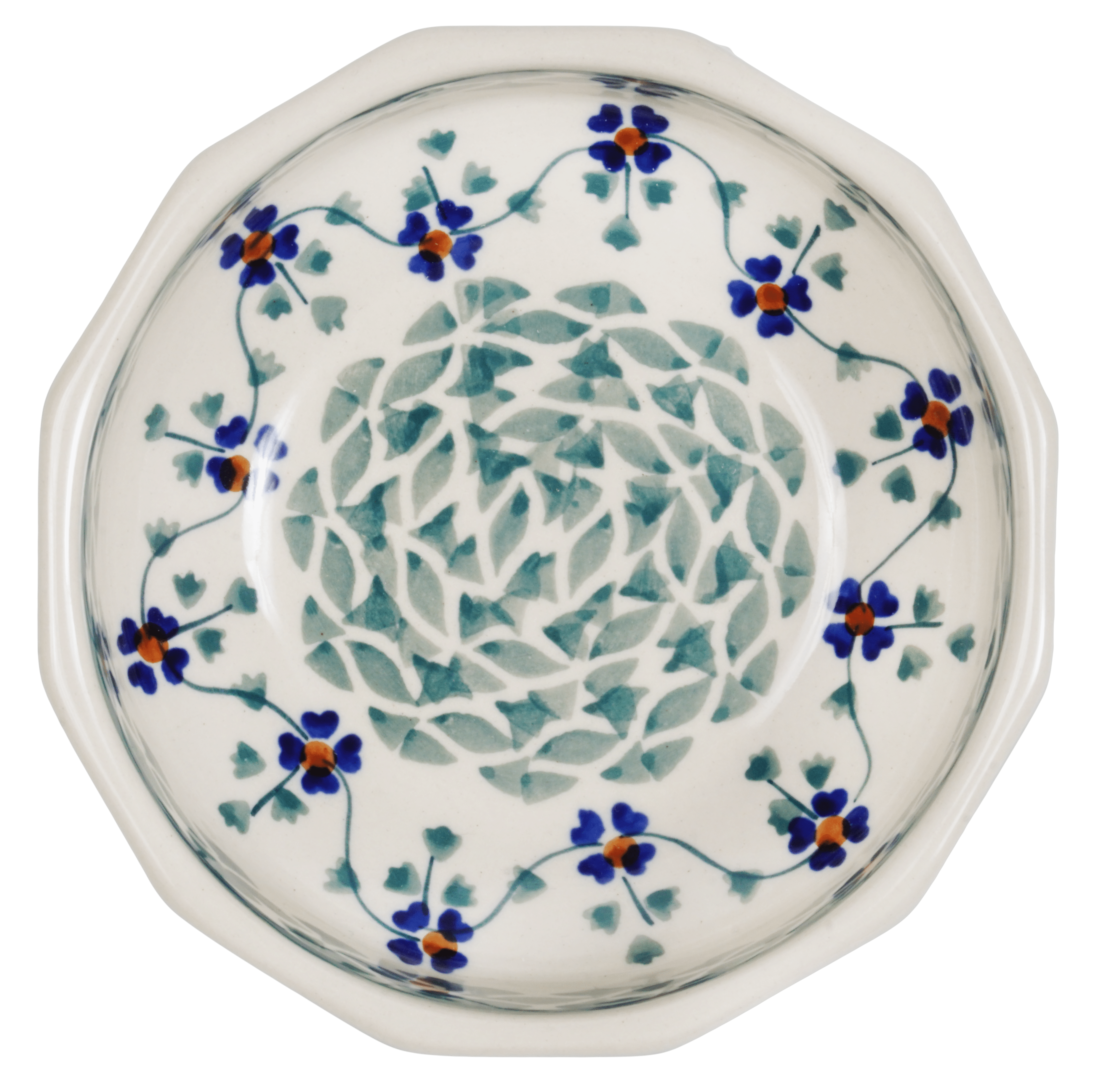 Imagine a piece of art that doubles as a functional delight in your daily life. Introducing the Polish Pottery Bowl from Manufaktura, featuring the enchanting "Woven Pansies" pattern. This isn't just any bowl; it's a 5-inch multiangular masterpiece, perfect for holding everything from your favorite dips and sides to ice cream and fruit. Even more, it can serve as a charming container for your jewelry. Each bowl is a testament to the traditional artistry that Polish pottery is renowned for, with a lovely white background and a green woven center that captures the eye.