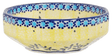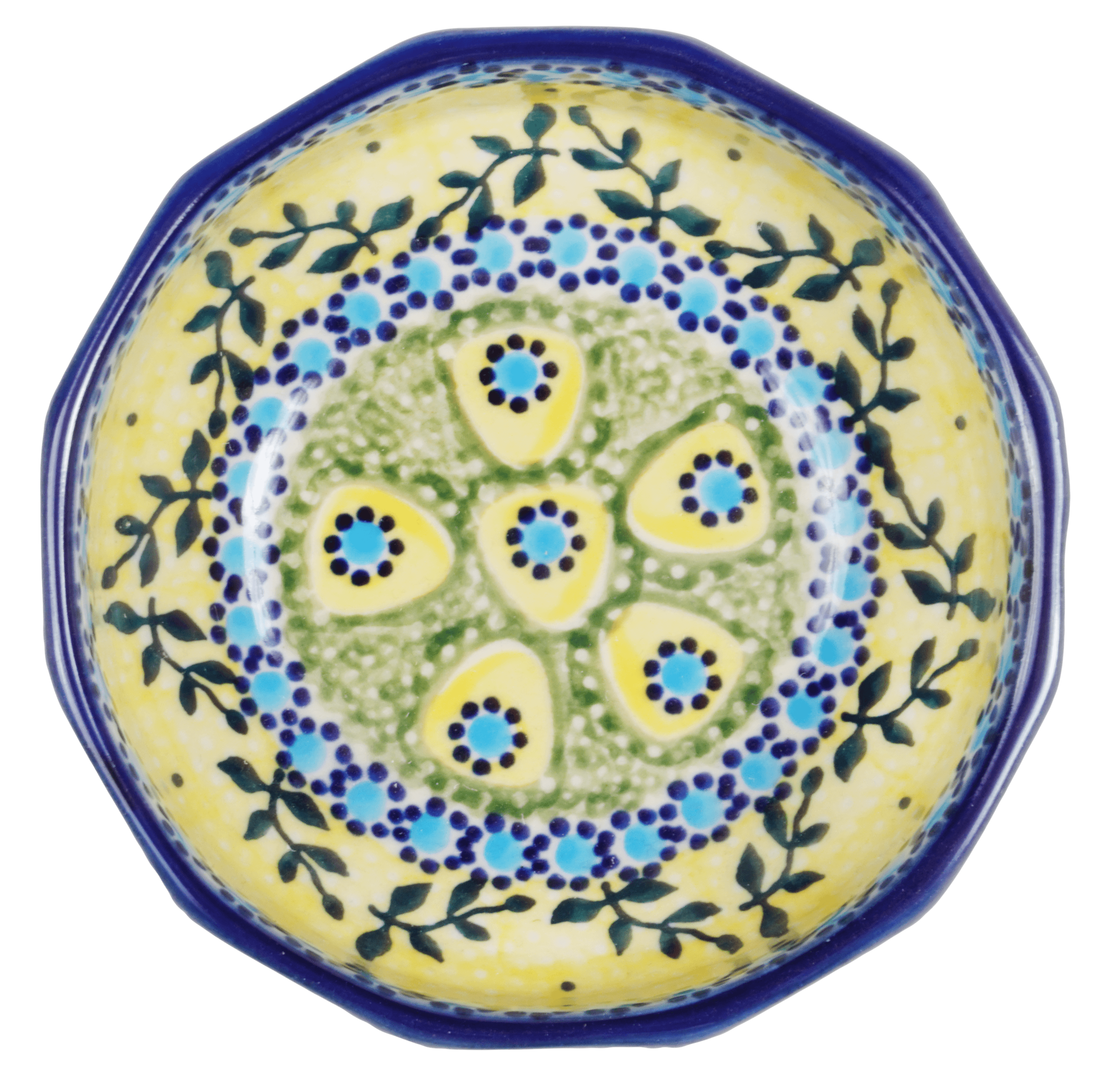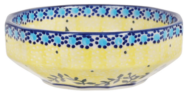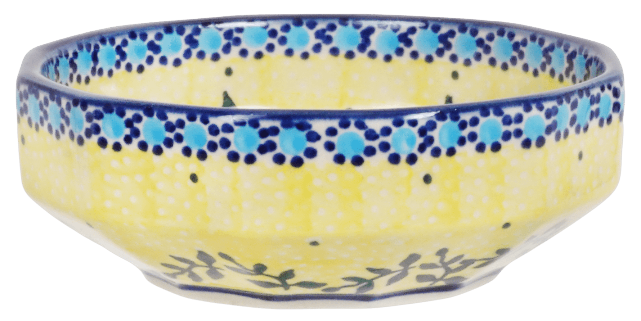 Introducing the Polish Pottery 5" Round Multiangular Bowl by Manufaktura in the delightful "Sunnyside Up" pattern (GAJ). These bowls are not just your ordinary kitchenware - they are versatile, stylish, and can bring a touch of joy to any occasion. Whether you're serving up dips, sides, ice cream, yogurt, fruit, or even using it to hold your favorite jewelry, this bowl is the perfect addition to your collection.