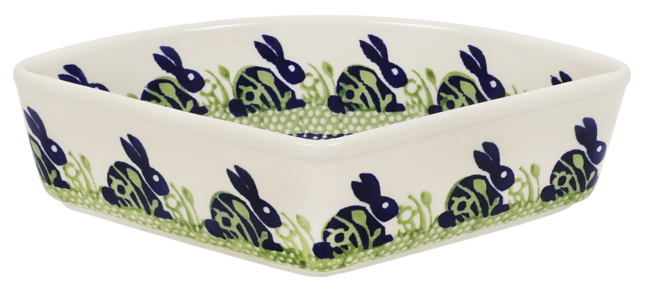 Introducing the Polish Pottery Wedge-Shaped Bowl by Manufaktura in the delightful "Bunny Love" pattern (P324). Prepare to be amazed by the versatility and stunning design of these bowls! Not only are they perfect for side dishes, snacks, dips, nuts, or candy, but they also offer endless possibilities for creativity. Let your imagination run wild as you explore the countless ways to use and display these beautiful bowls.