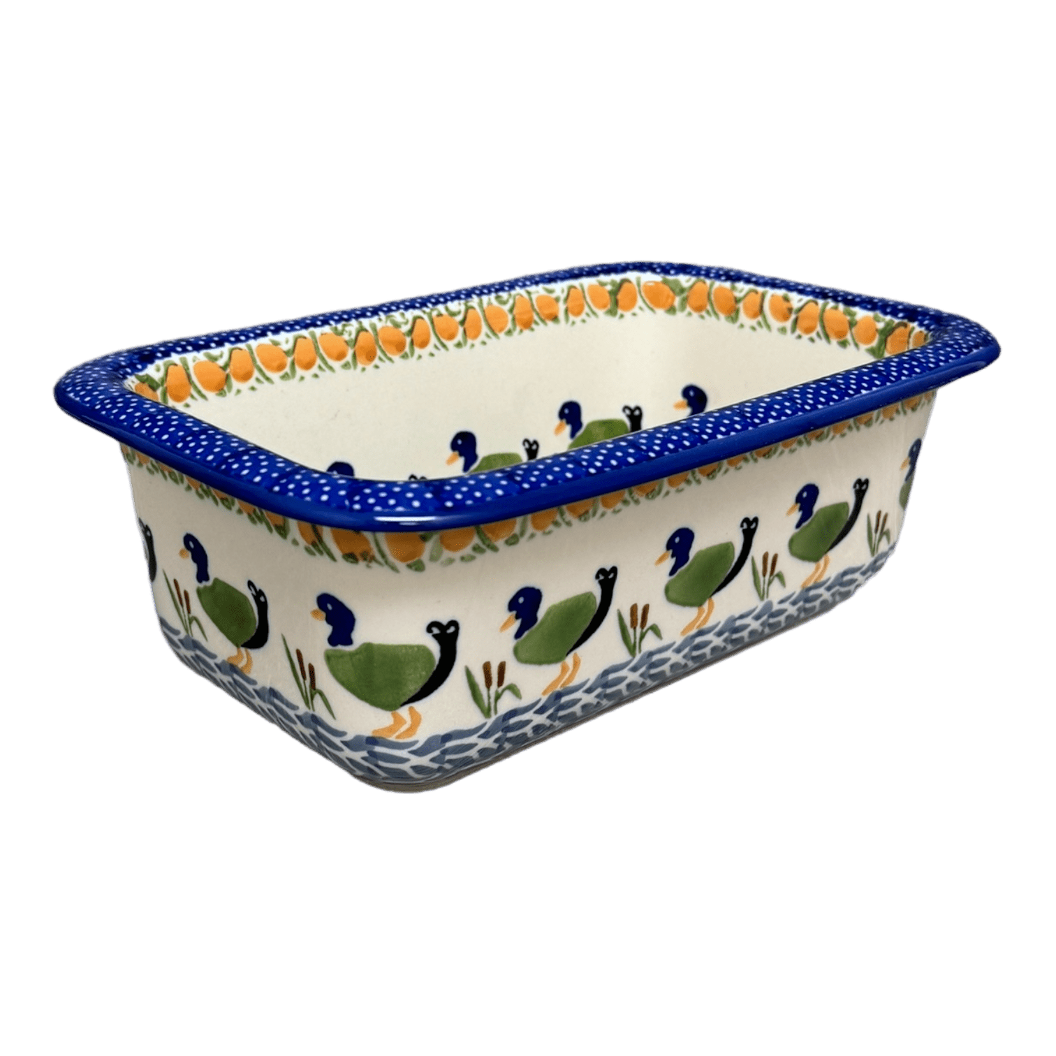 Imagine the delightful aroma of freshly baked bread wafting through your kitchen. Now, picture that bread emerging from an exquisite Polish Pottery Bread Baker, specifically the 9.5" x 6" masterpiece crafted by Manufaktura in the charming "Ducks in a Row" pattern. This isn't just any bread baker; it's a canvas of artistry, featuring playful ducks aligned in harmonious patterns against a serene white background, accented with touches of blue, green, white, and gold. Each duck, detailed with a blue head and surrounded by quaint green and brown cattail plants, faces counterclockwise, adding a whimsical twist to your culinary creations.