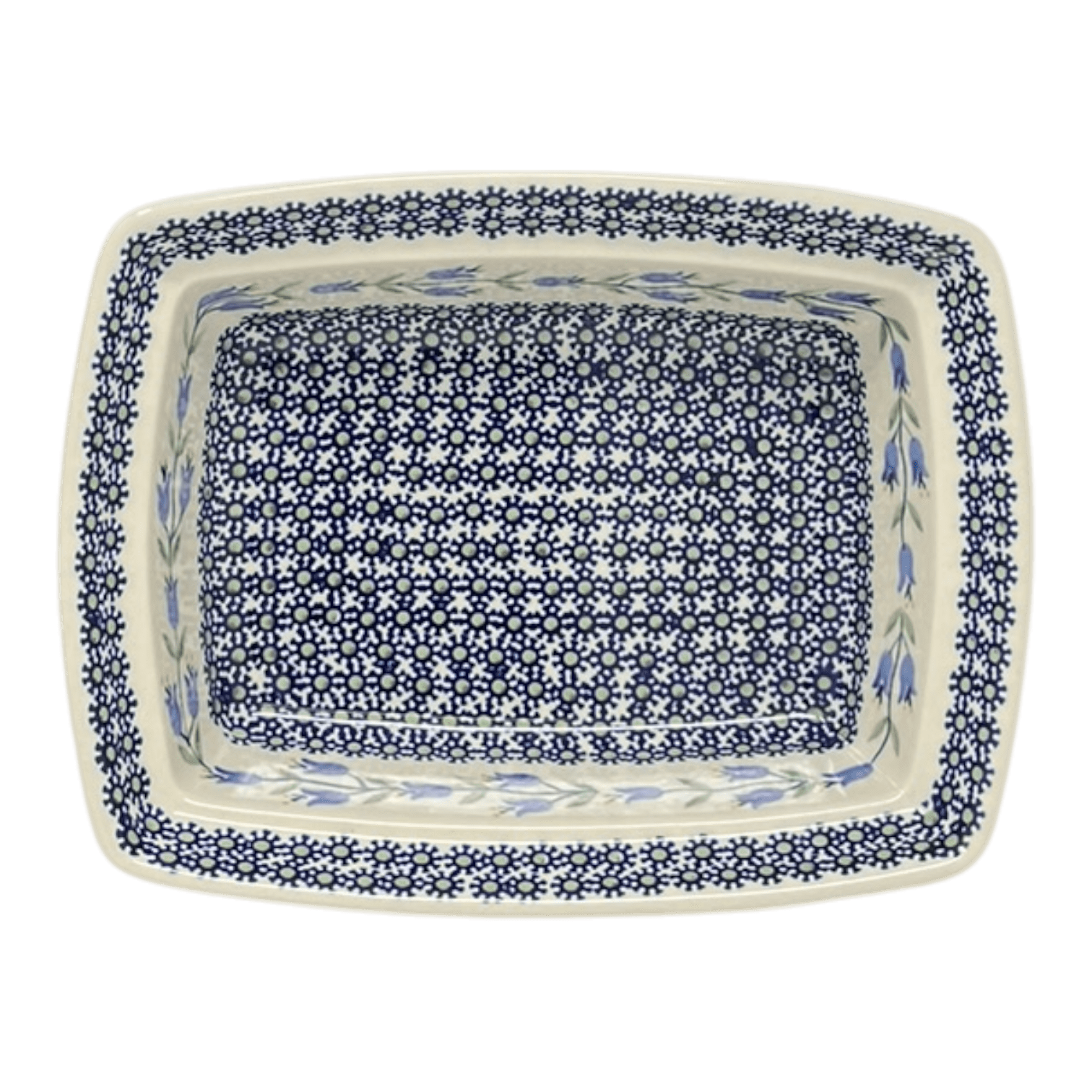 Imagine transforming your dining experience with the enchanting charm of the Polish Pottery Casserole, a masterpiece from Manufaktura. Crafted in the quaint town of Boleslawiec, Poland, this deep, rectangular baker (7.5" x 10") is not just a vessel for your culinary creations; it's a slice of artistry. The "Lily of the Valley" pattern adorning this piece features a delightful dance of blue and green blossoms on a pristine white background, framed by delicate light blue bellflowers twining on a green vine. It's like serving dinner on a canvas painted by nature itself!