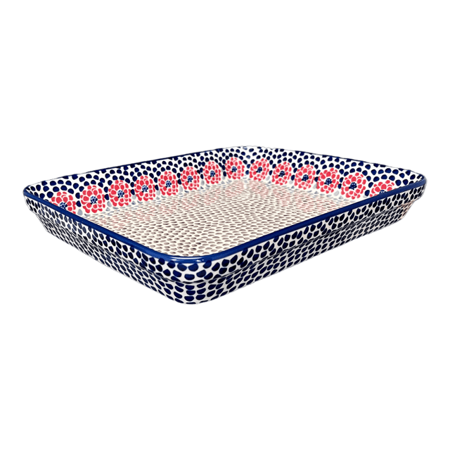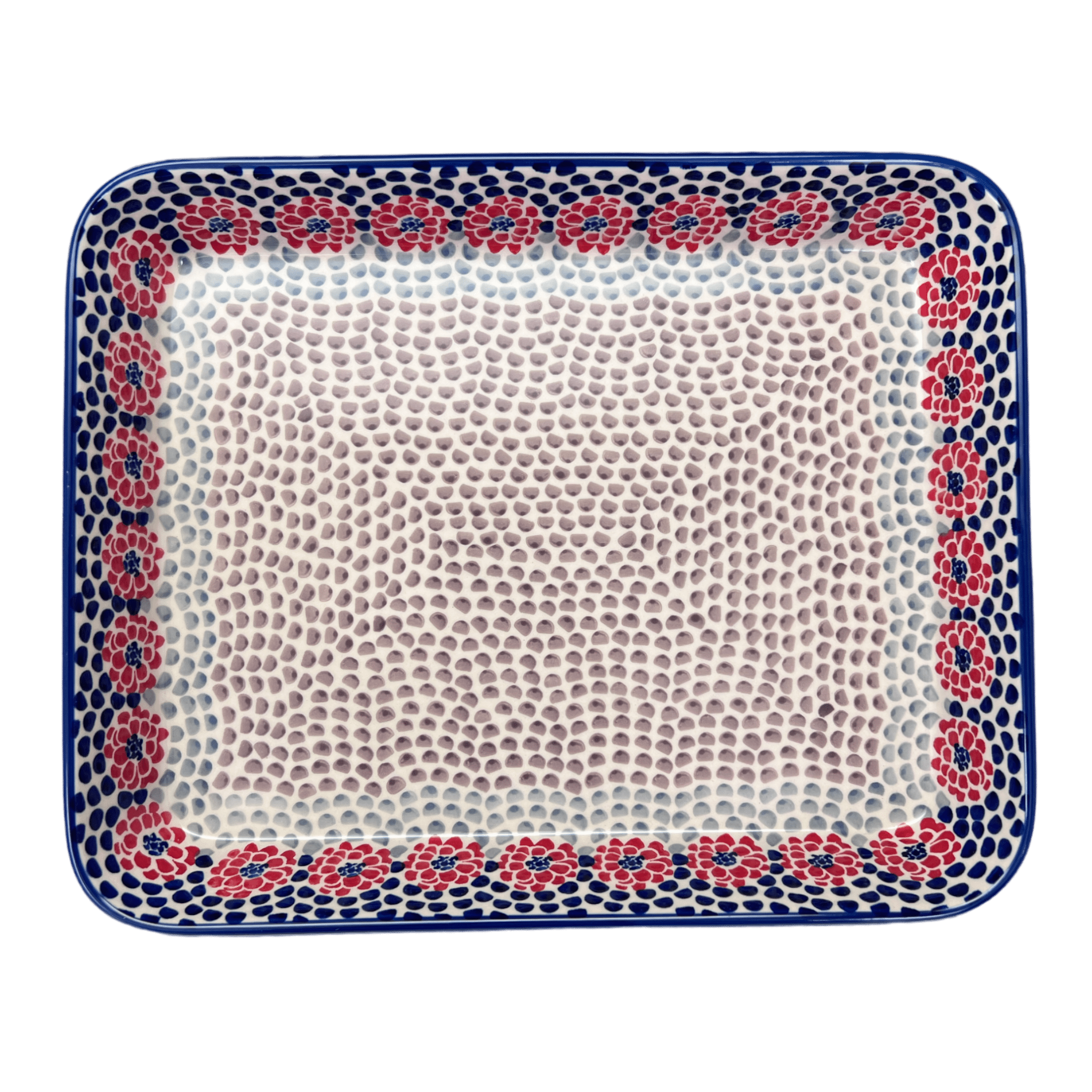 The "Falling Petals" pattern is a work of art, featuring an array of vibrant flowers in a mesmerizing blend of red, blue, and gray. Each design element is meticulously hand-painted by skilled artisans in Boleslawiec, Poland, ensuring that no two bakers are exactly alike. The attention to detail is simply awe-inspiring!