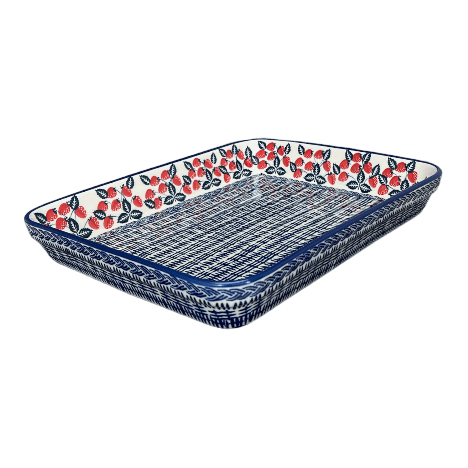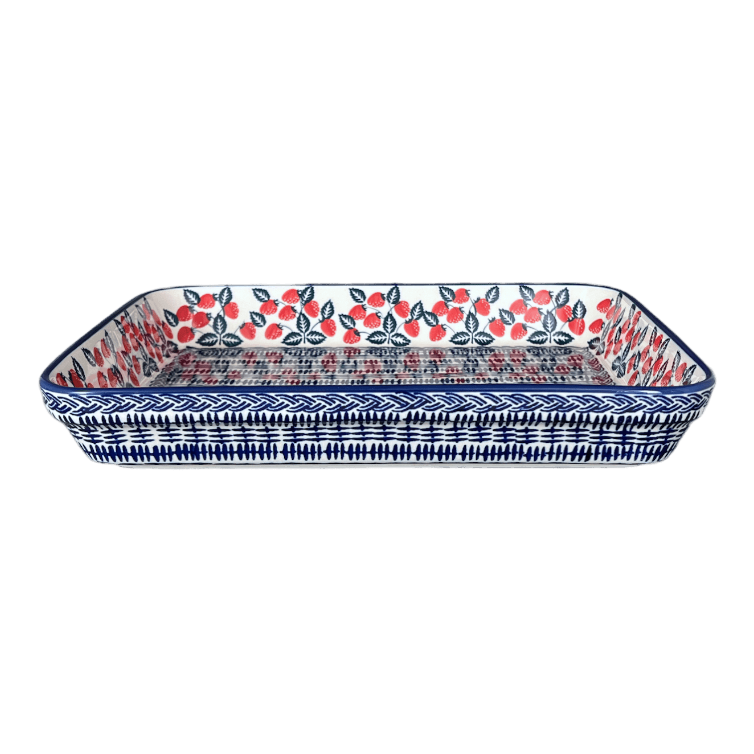 Introducing the Polish Pottery 10" x 13" Rectangular Baker by Manufaktura, the perfect addition to your kitchenware collection! This shallow rectangular baker is not only incredibly versatile, but it also showcases the stunning "Fresh Strawberries" pattern. With its vibrant red color adorned with accents in green, blue, and white, this baker will surely catch everyone's eye!