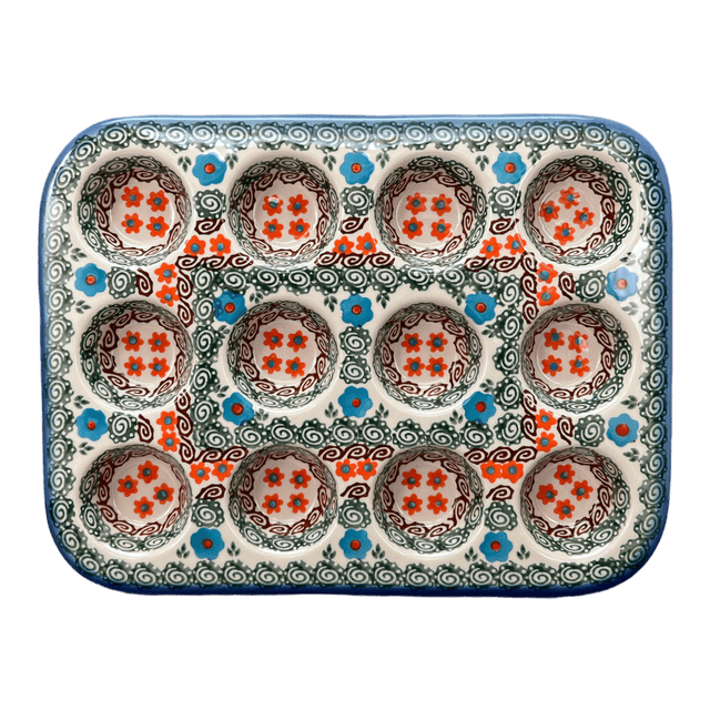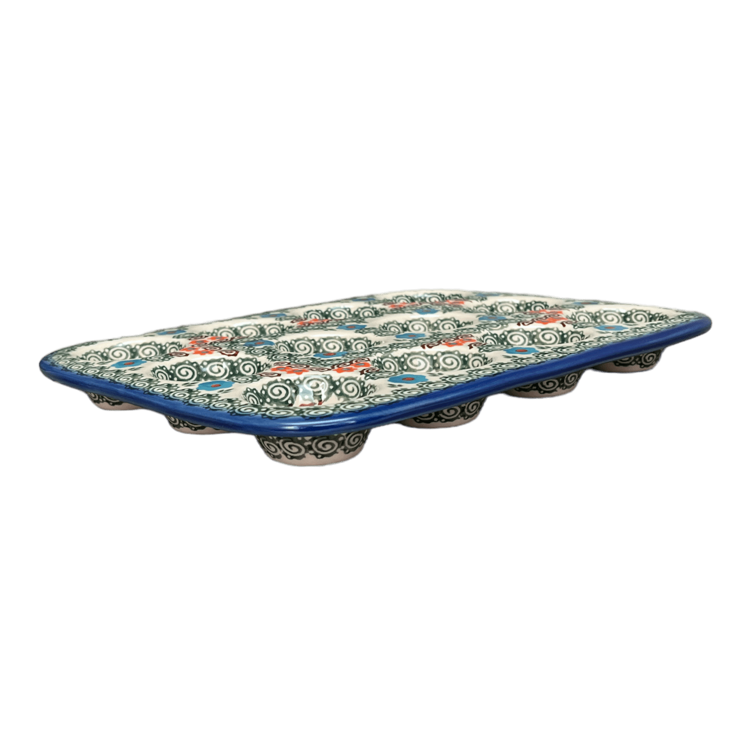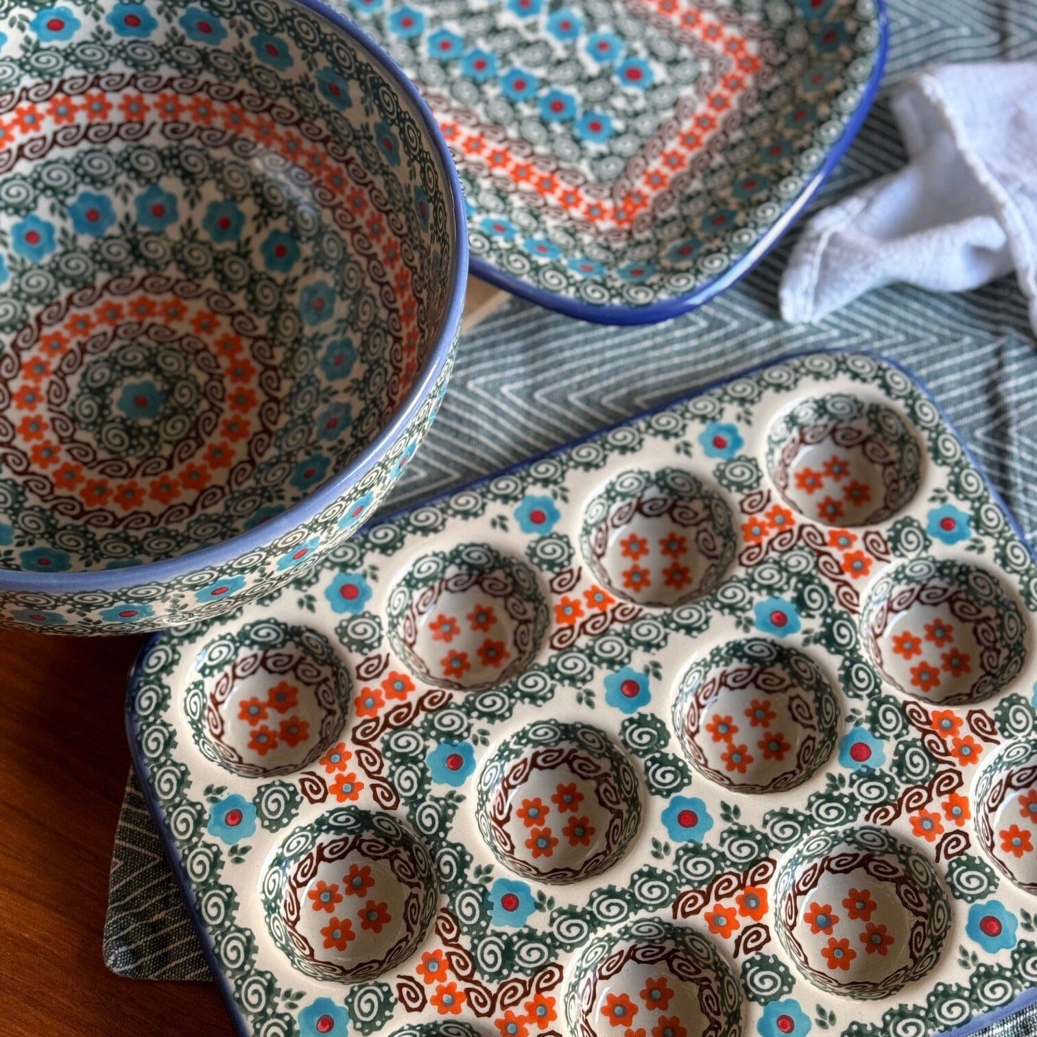 Step into the vibrant world of baking with the Polish Pottery Muffin Pan, a delightful addition to any kitchen! Crafted by the renowned artisan Andy, this 12-cup mini muffin pan isn't just a baking tool—it's a piece of art adorned with the enchanting "Teal Pompons" pattern. Picture your muffins and cupcakes, not only bursting with flavors but also dressed in a captivating display of teal flowers and spirals. The high gloss glaze not only adds a splash of brilliance but ensures your baked delights slide out effortlessly, perfectly shaped and irresistibly tempting.